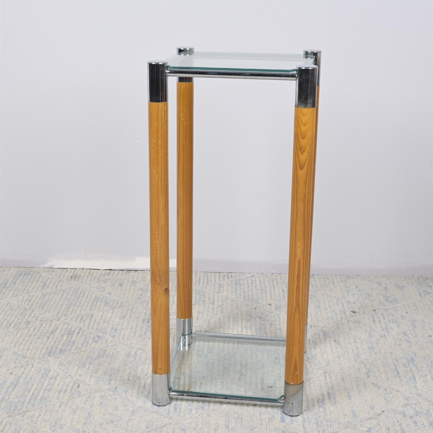 A 1980'S PINE AND CHROME TWO TIER PEDESTAL WITH GLASS SHELVES (94H X 41W X 41D CM) (LEONARD JOEL DELIVERY: LARGE)