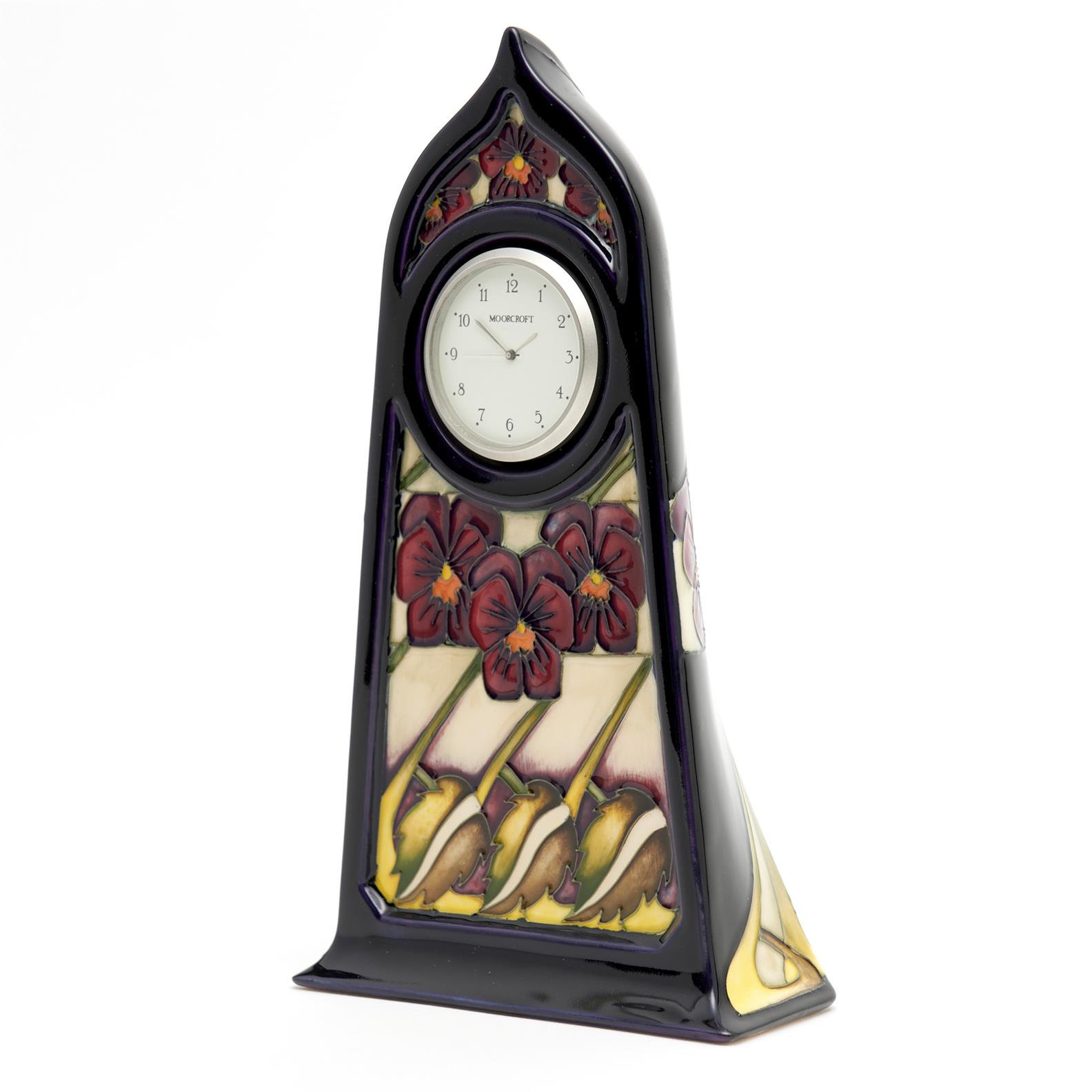 A MOORCROFT PANSY PATTERN DESK CLOCK H.23CM, LEONARD JOEL DELIVERY SIZE: MEDIUM