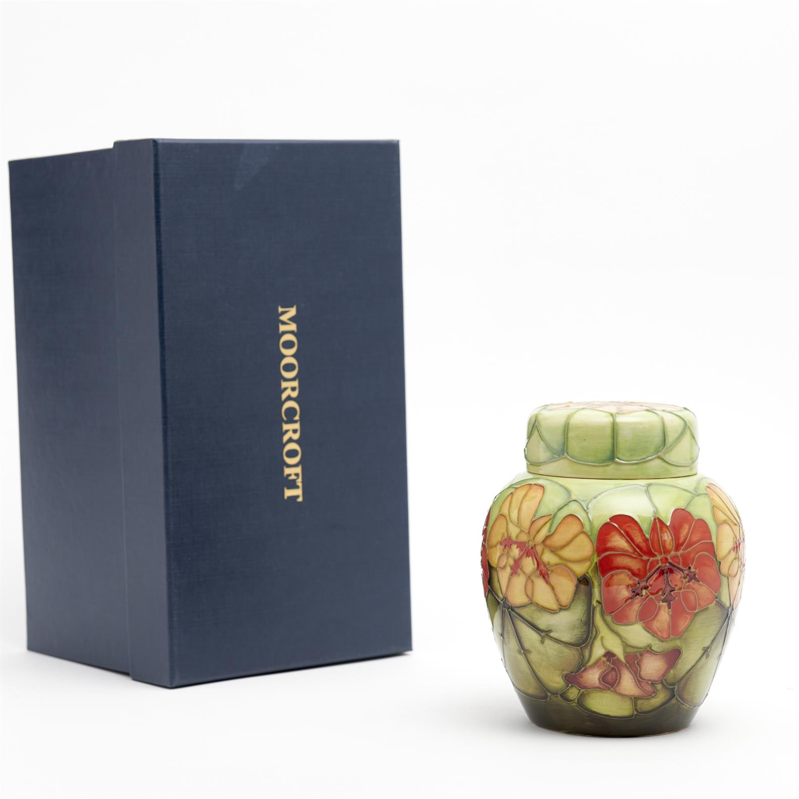 A MOORCROFT 'NASTURTIUM' PATTERN GINGER JAR DESIGNED BY SALLY TUFFIN H.16CM, LEONARD JOEL DELIVERY SIZE: MEDIUM