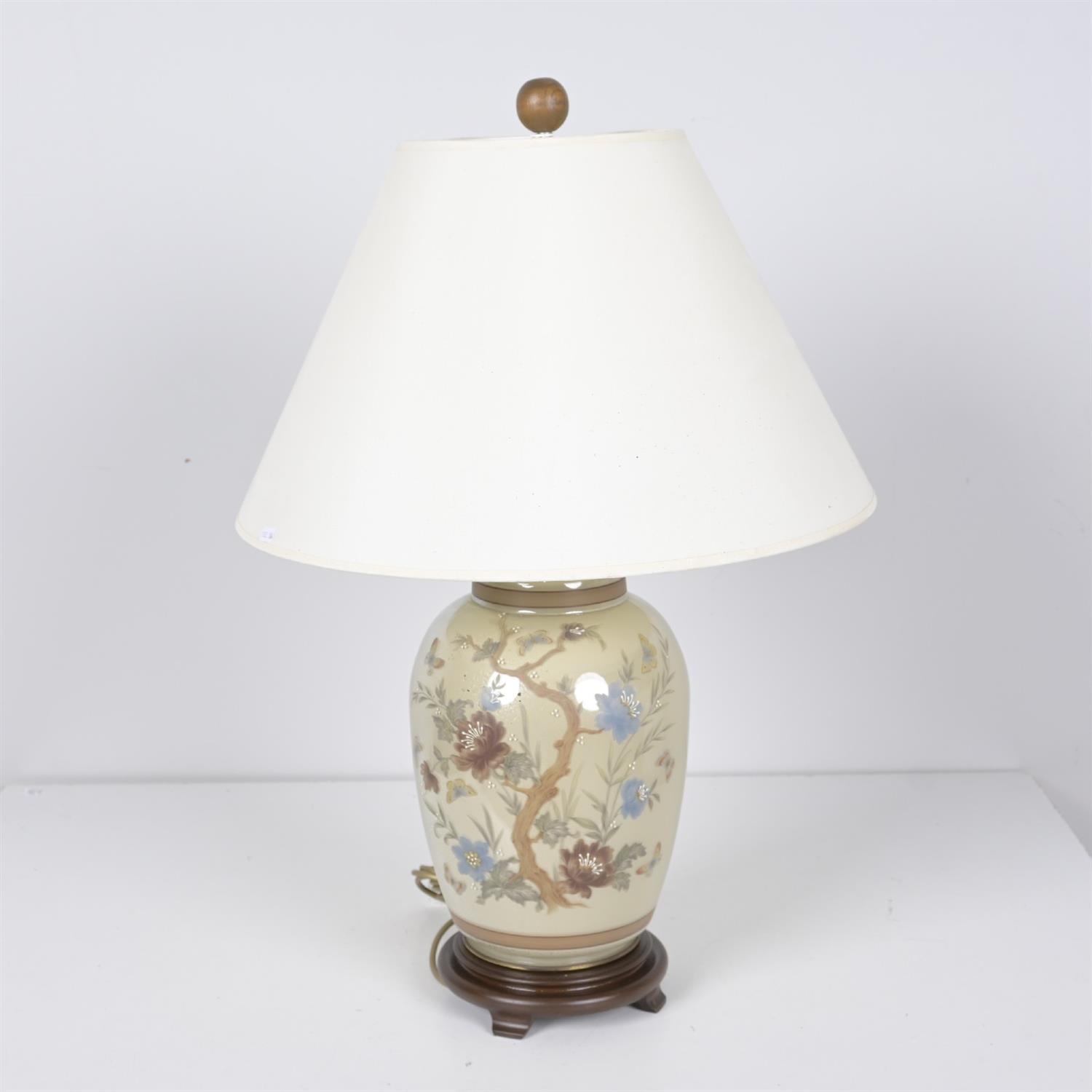 A 1950S CHINESE HAND PAINTED GLASS LAMP WITH SILK SHADE (81H X 55DIA CM) (LEONARD JOEL DELIVERY: MEDIUM)