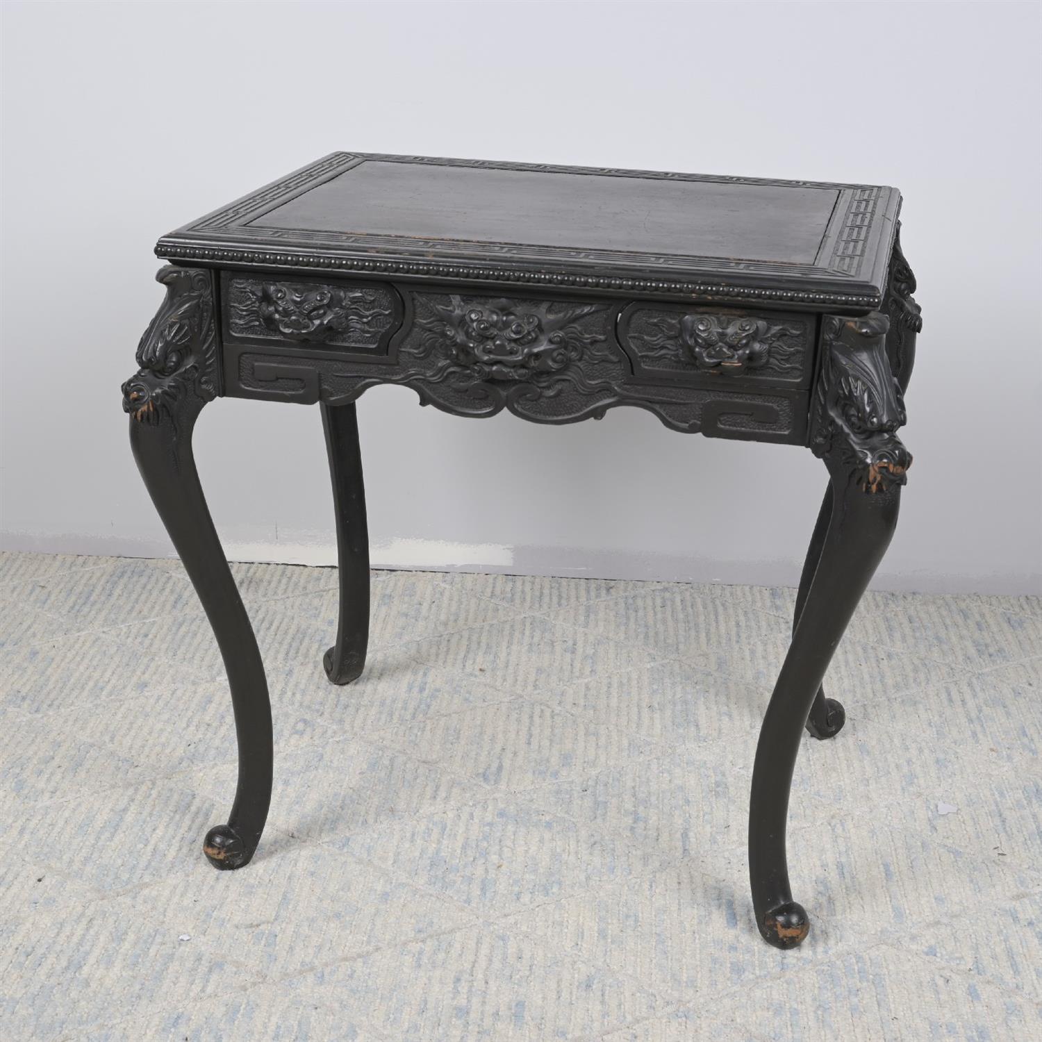 A LATE 19th CENTURY JAPANESE CARVED AND EBONISED PINE CENTRE TABLE IN CHINESE STYLE, WITH DRAWERS TO ALL SIDES (A/F) (77H X 75W X 64D CM) (LEONARD JOEL DELIVERY: LARGE)