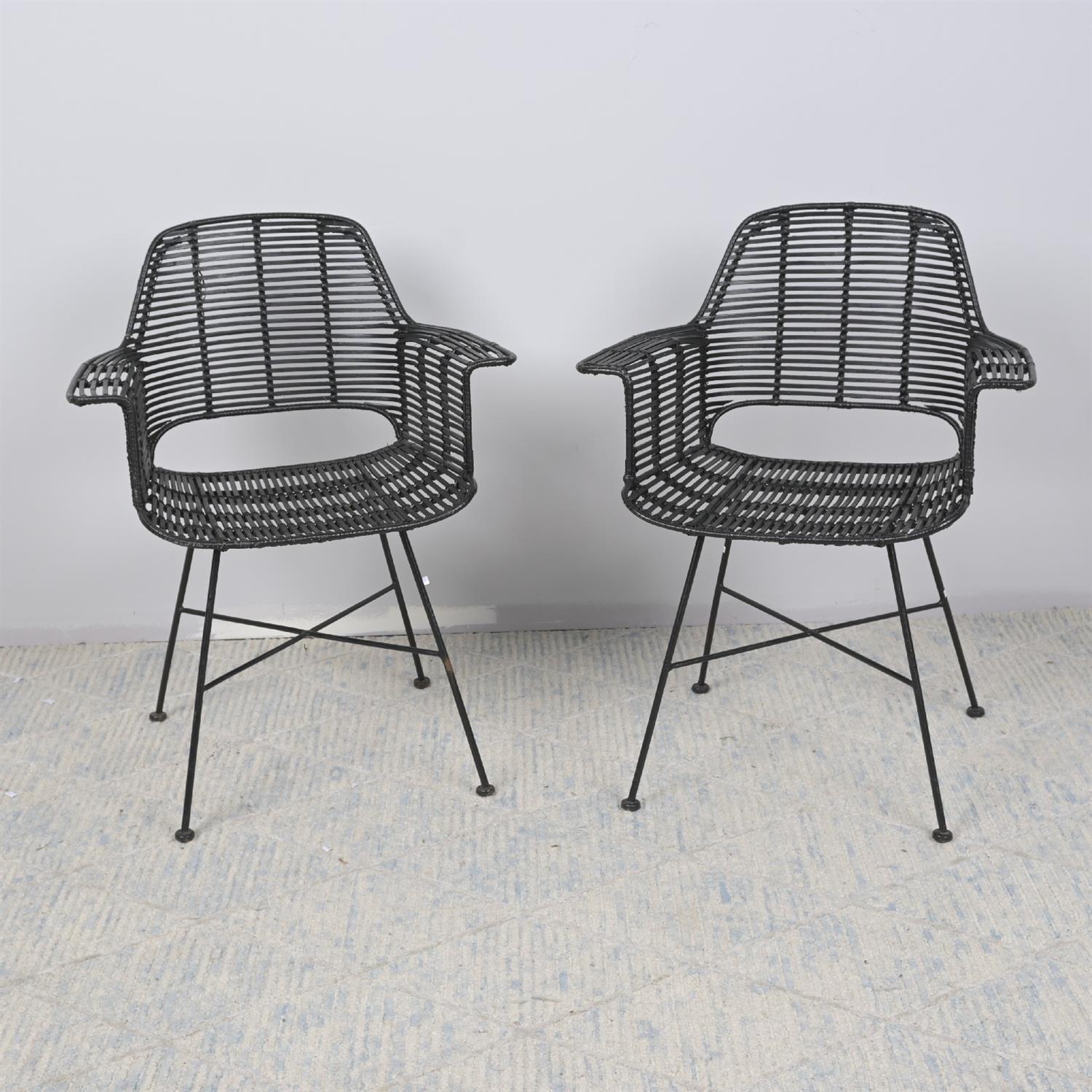A PAIR OF BLACK WOVEN CANE STEEL FRAMED ARM CHAIRS (A/F) (84H X 66W X 59D CM) (LEONARD JOEL DELIVERY: LARGE)