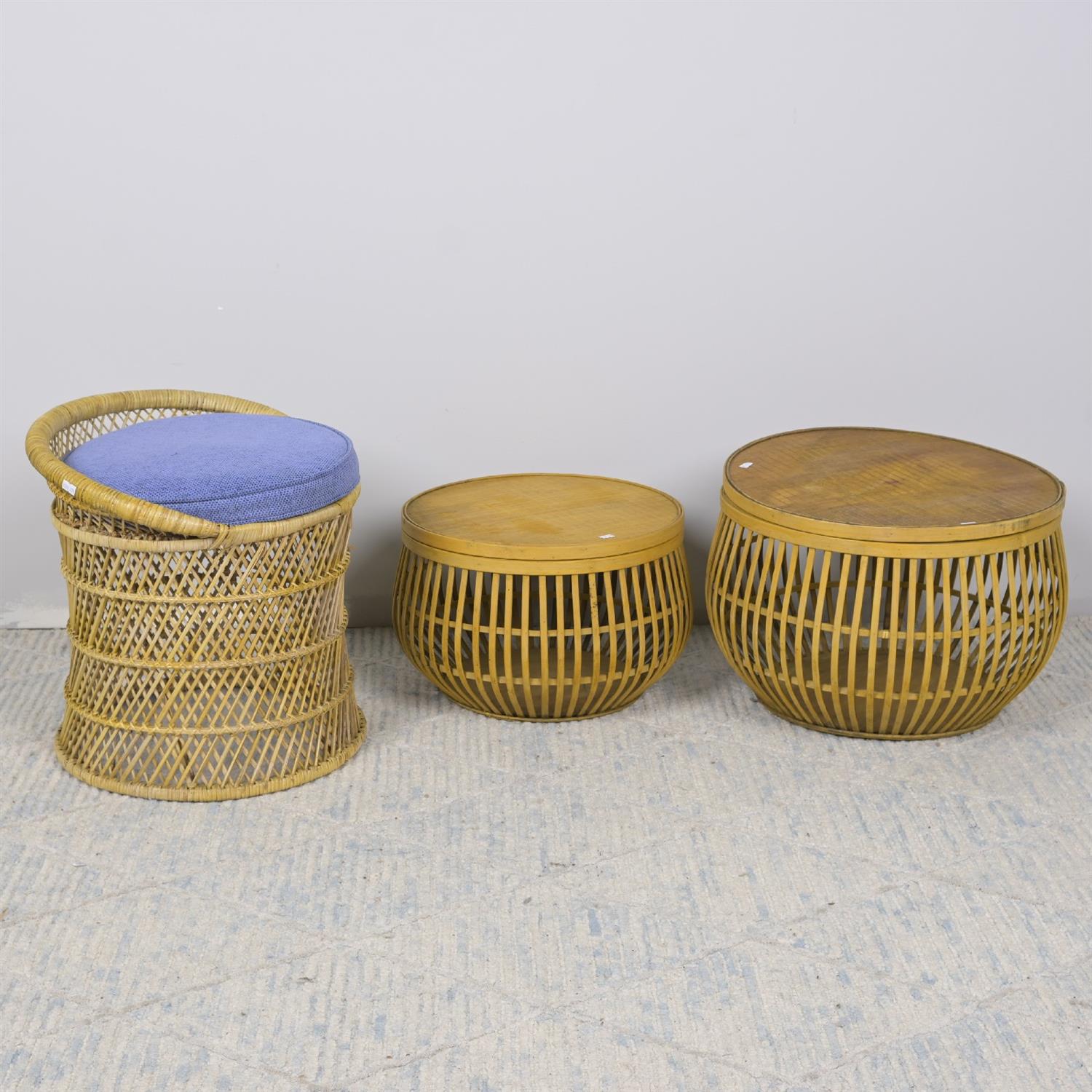 THREE PIECES OF WOVEN CAND LIDDED BASKET FORM SIDE TABLES AND STOOL (45H X 49DIA CM) (LEONARD JOEL DELIVERY: LARGE)