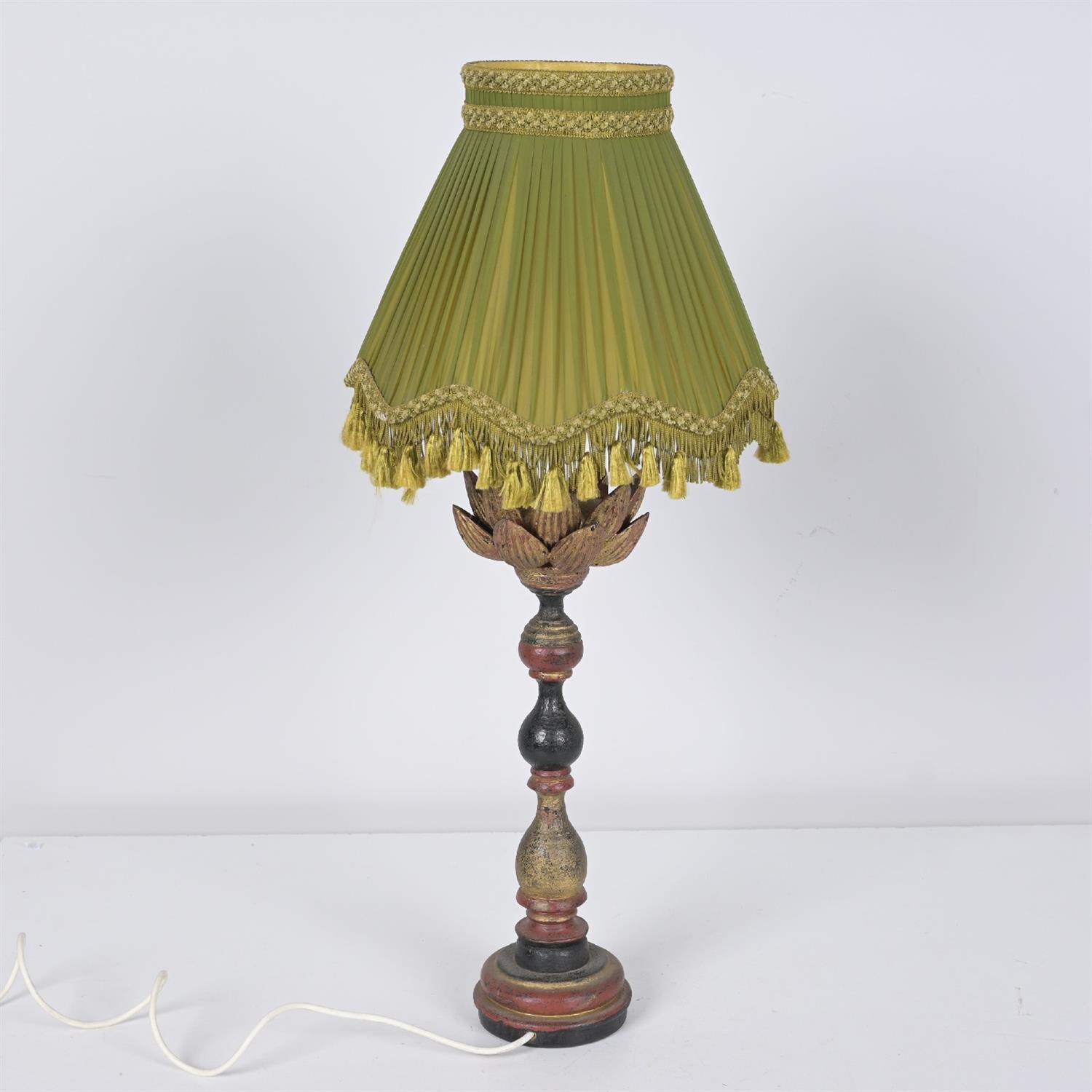AN ANTIQUE HAND PAINTED CARVED LOTUS FORM TABLE LAMP WITH GREEN SILK SHADE (78H CM) (LEONARD JOEL DELIVERY: MEDIUM)