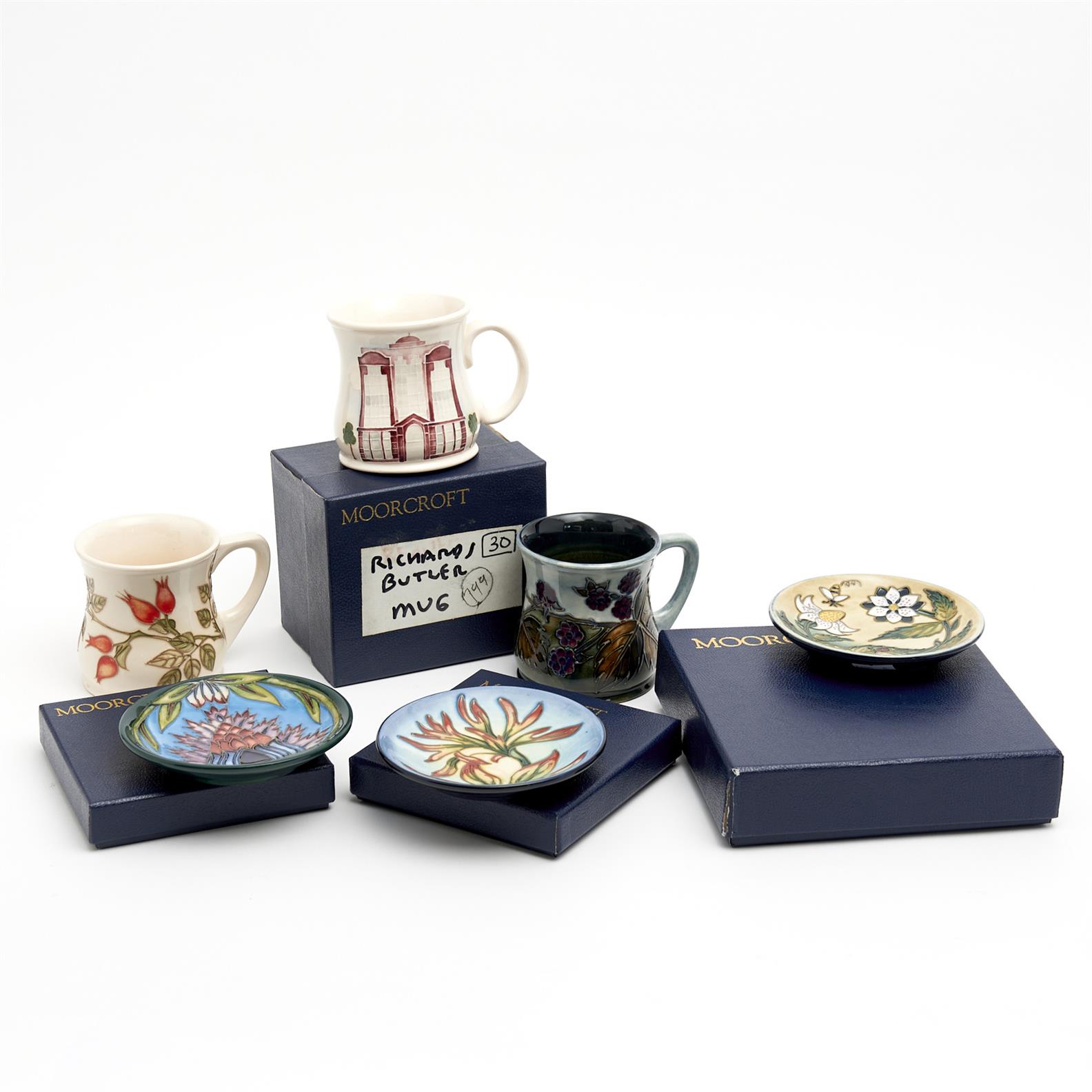 THREE MOORCROFT MUGS INCLUDING ONE COMMEMORATING BEAUFORT HOUSE, TOGETHER WITH THREE DISHES H.9CM, LEONARD JOEL DELIVERY SIZE: MEDIUM