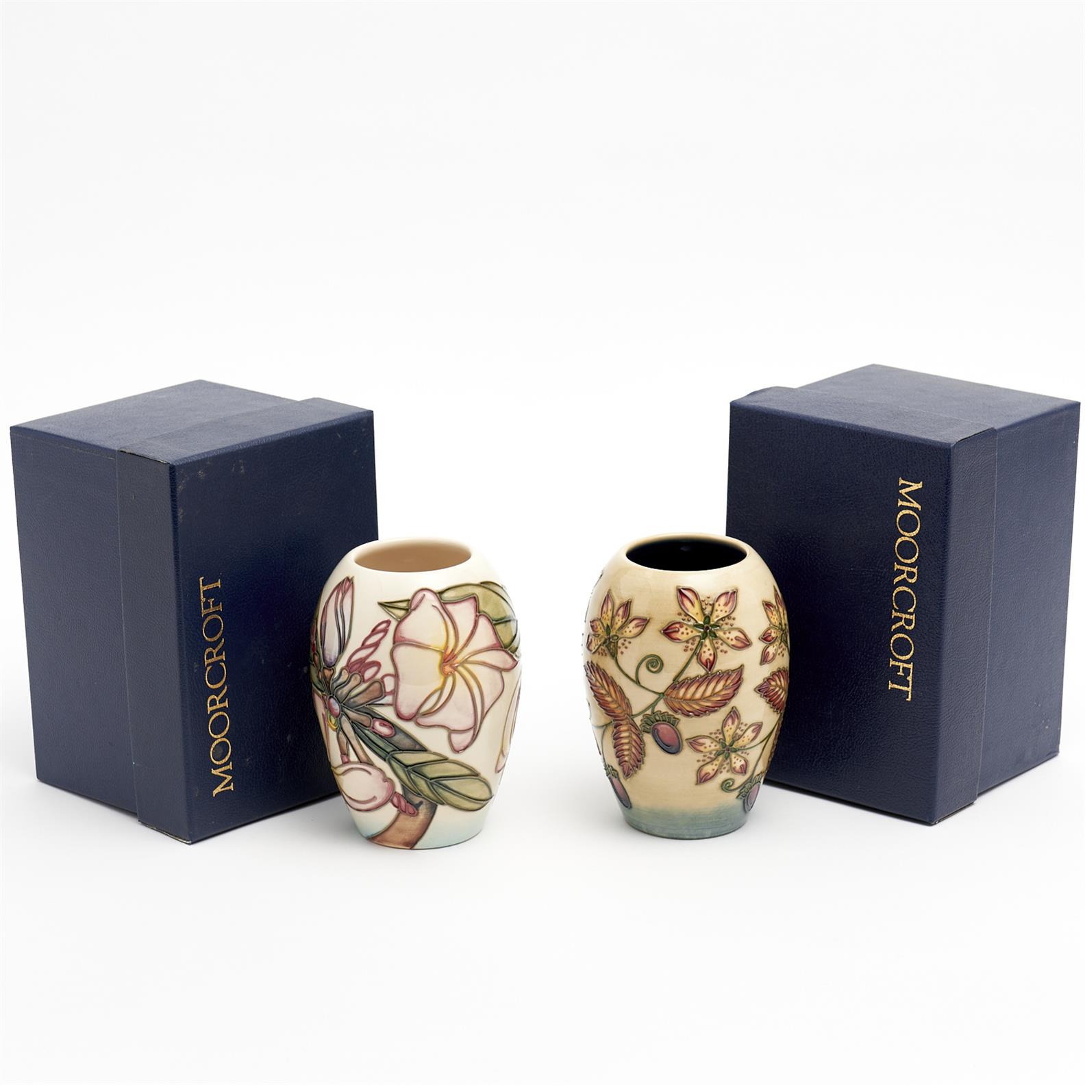TWO MOORCROFT VASES INCLUDING FRANGIPANI PLUMERIA AND SERVICE BERRY PATTERNS H.13.5CM (LARGEST), LEONARD JOEL DELIVERY SIZE: MEDIUM