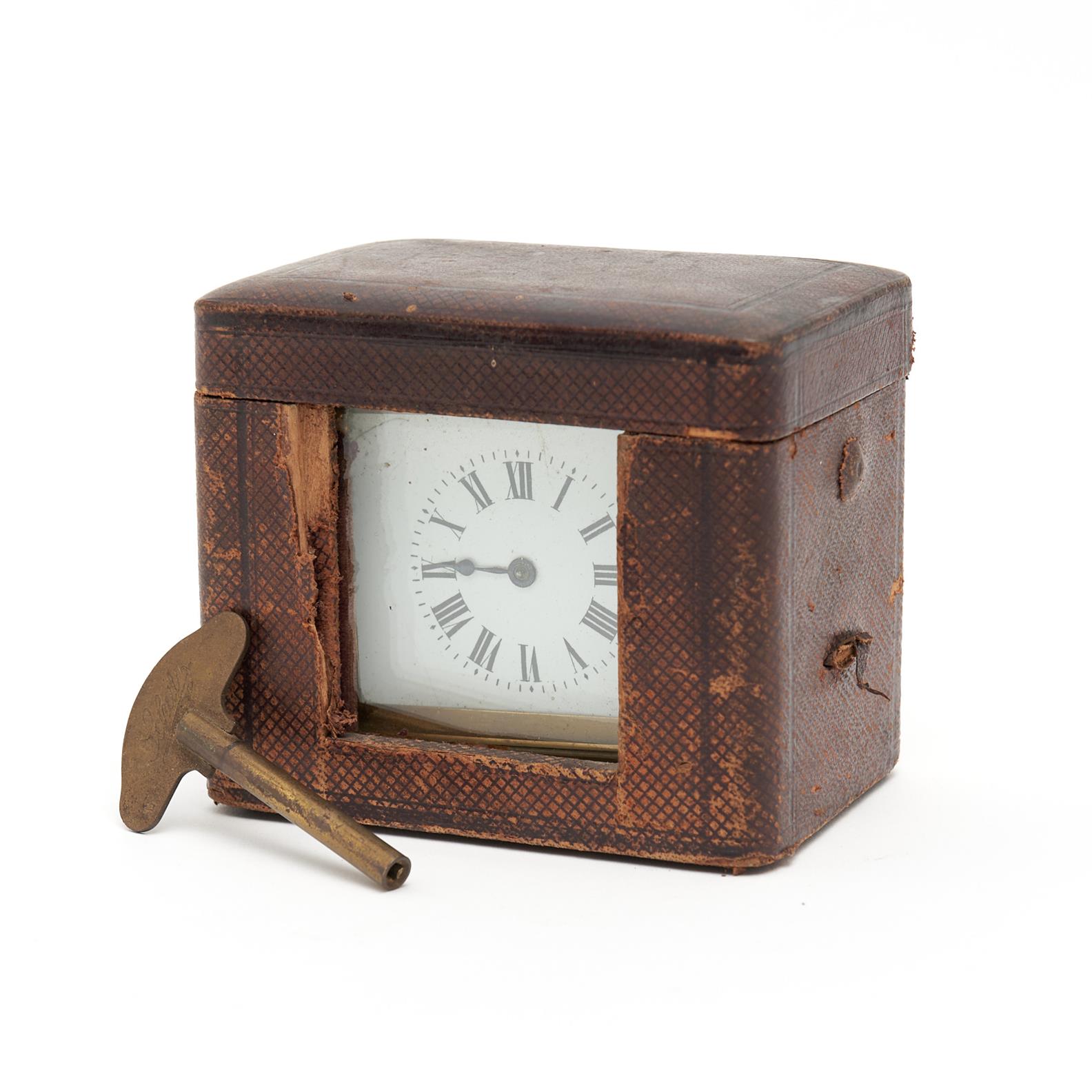 A LEATHER CASED BRASS CARRIAGE CLOCK WITH KEY H.10CM, LEONARD JOEL DELIVERY SIZE: SMALL