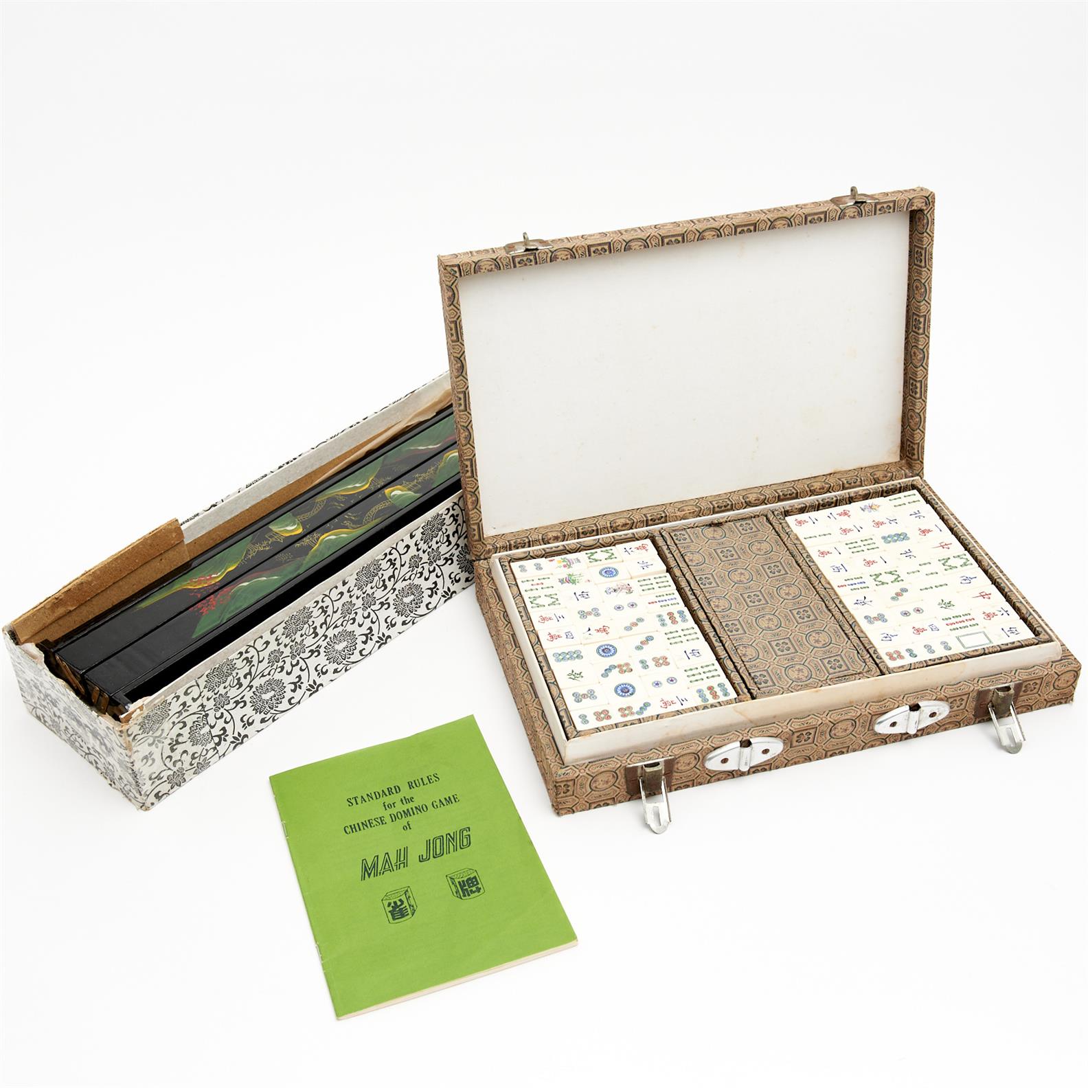 A CASED CHINESE BONE AND BAMBOO MAH JONG SET WITH LACQUERED HAND PAINTED STANDS L.33CM (BOX), LEONARD JOEL DELIVERY SIZE: MEDIUM