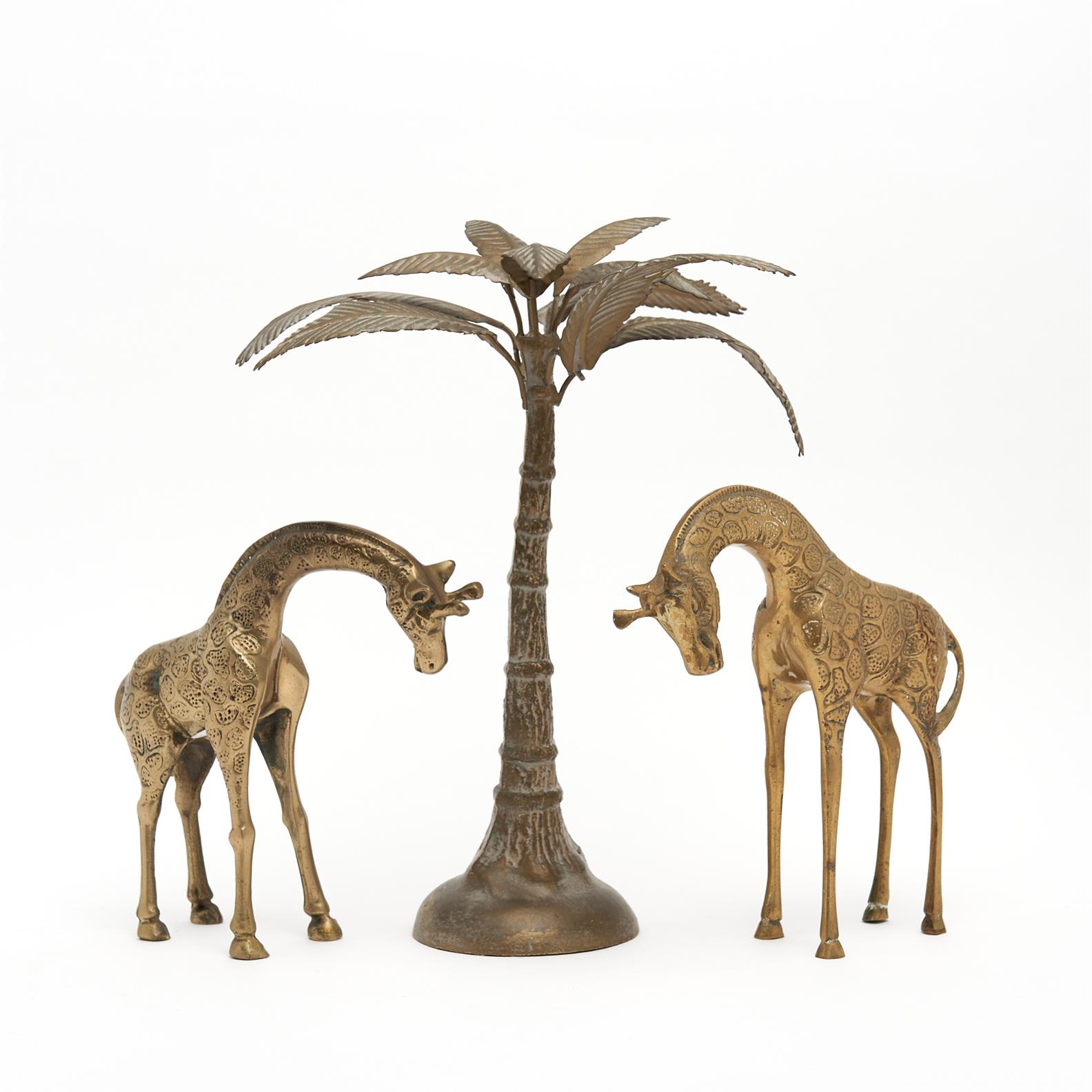 TWO BRASS GIRAFFES AND A PALM TREE H.34CM (PALM TREE), LEONARD JOEL DELIVERY SIZE: MEDIUM