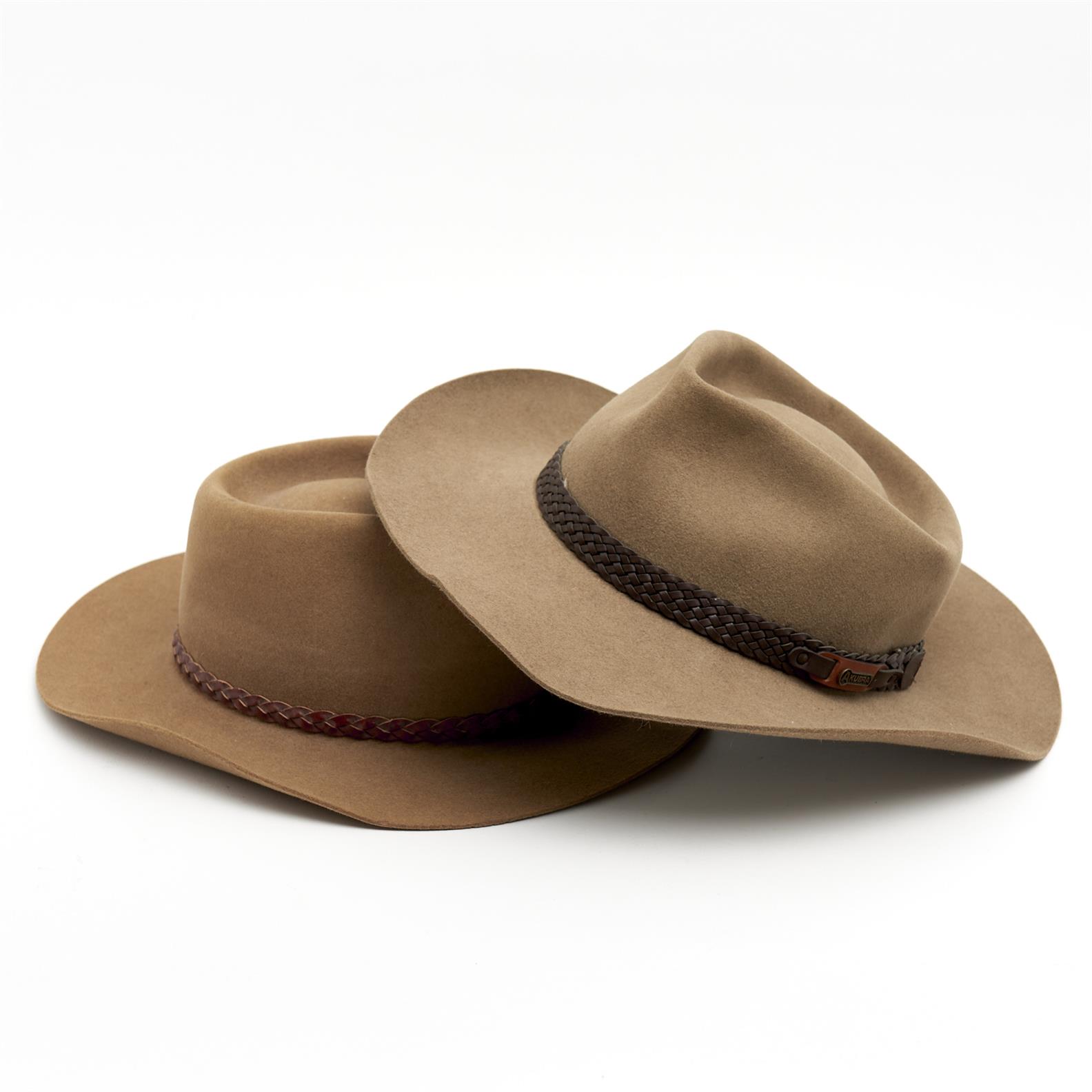 TWO AKUBRA FELT HATS INCLUDING SNOWY RIVER AND STOCKMAN W.35CM, LEONARD JOEL DELIVERY SIZE: MEDIUM