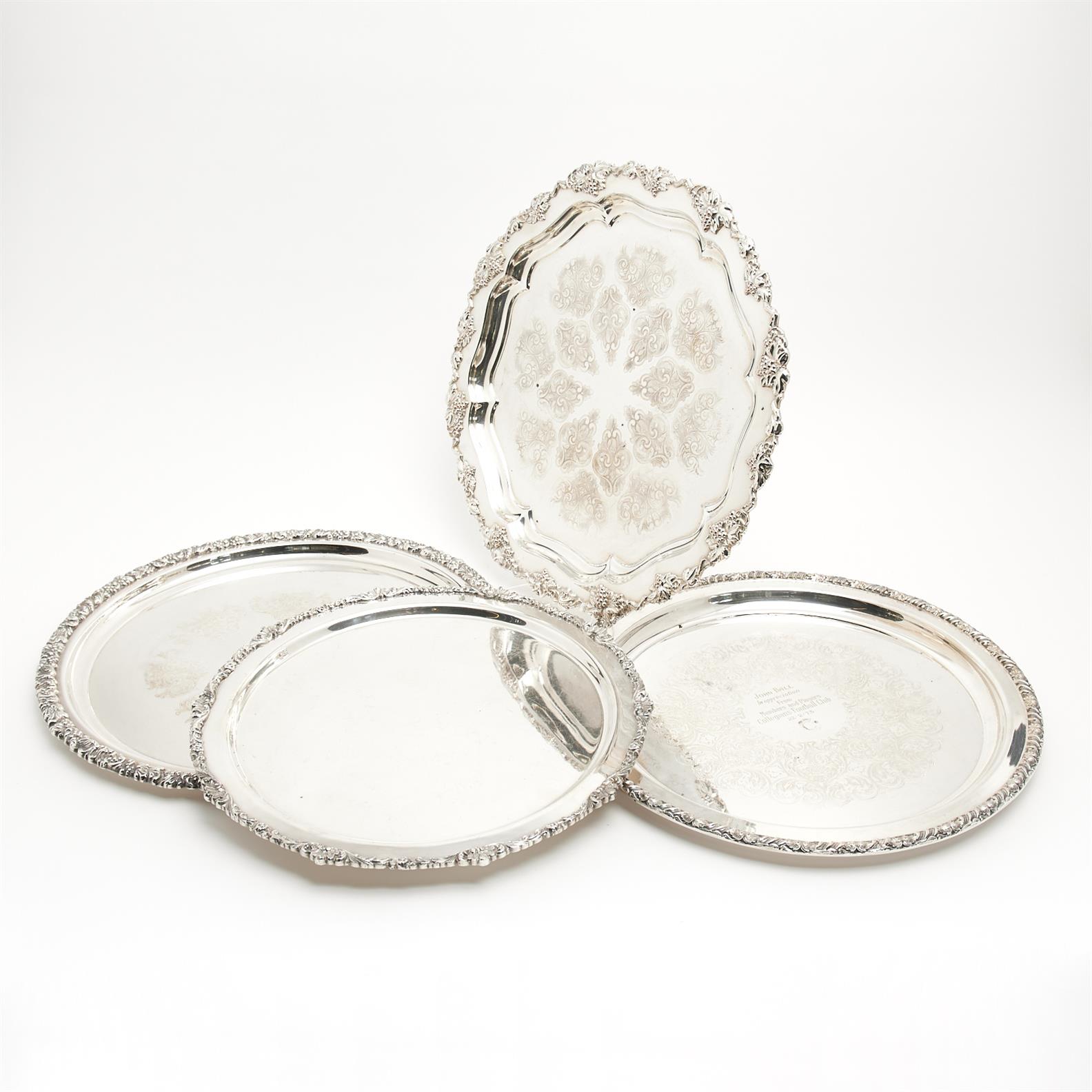 A GROUP OF FOUR SILVERPLATED CIRCULAR TRAYS DIA.36CM (LARGEST), LEONARD JOEL DELIVERY SIZE: LARGE