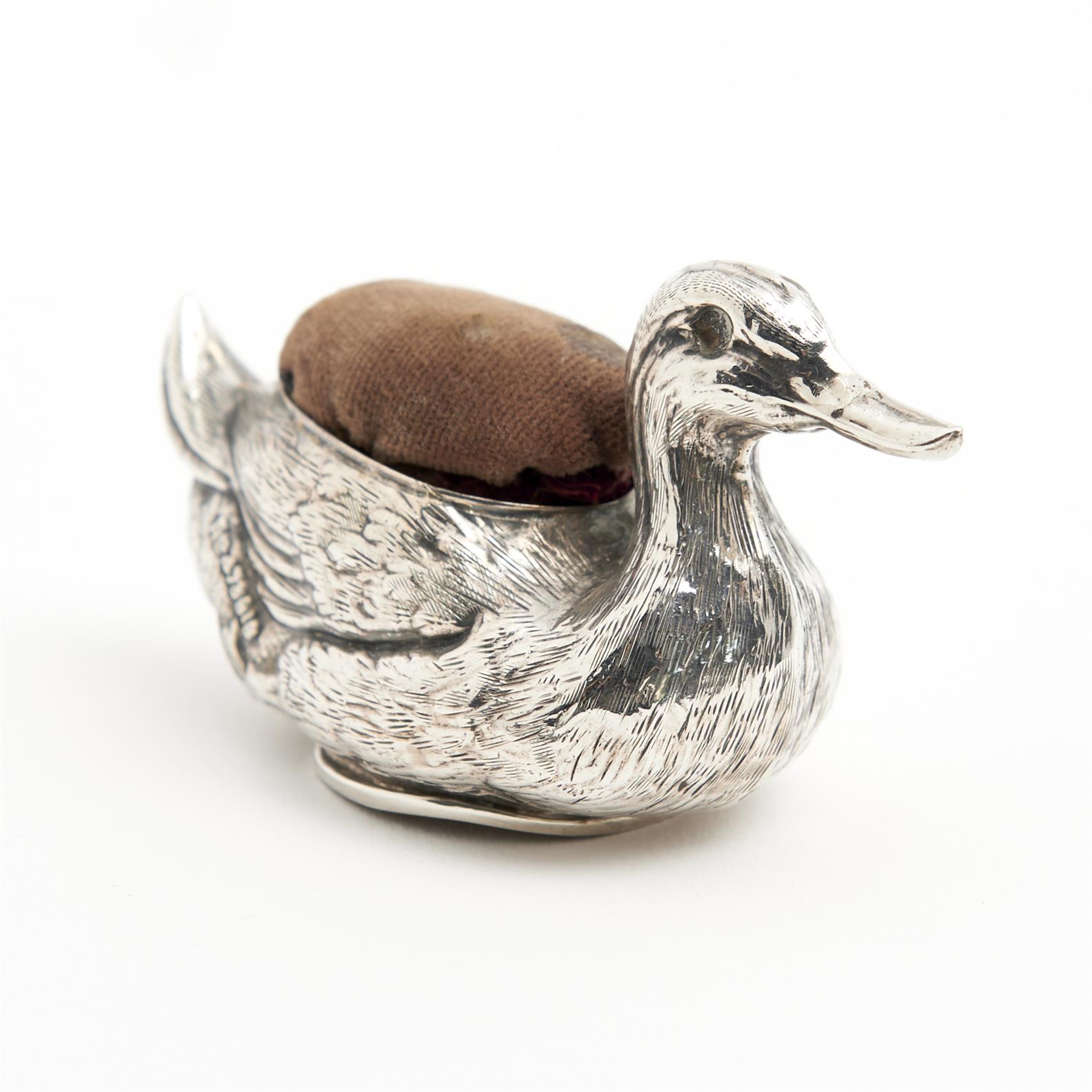 A STERLING SILVER DUCK-FORM PIN CUSHION L.7.5CM, LEONARD JOEL DELIVERY SIZE: SMALL