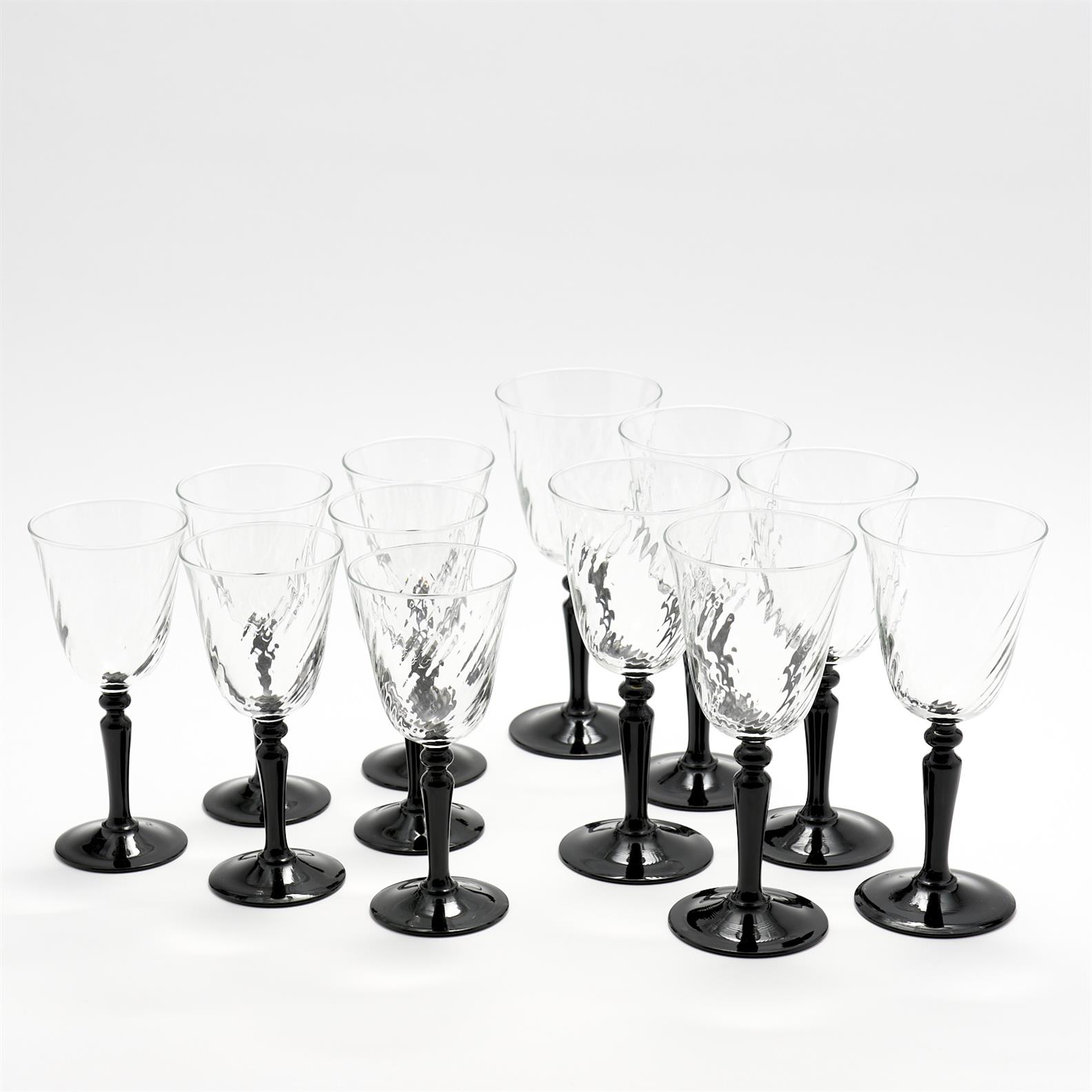 TWO SET OF SIX FRENCH BLACK AND CLEAR GLASS WINE GLASSES H.18CM (TALLEST), LEONARD JOEL DELIVERY SIZE: MEDIUM