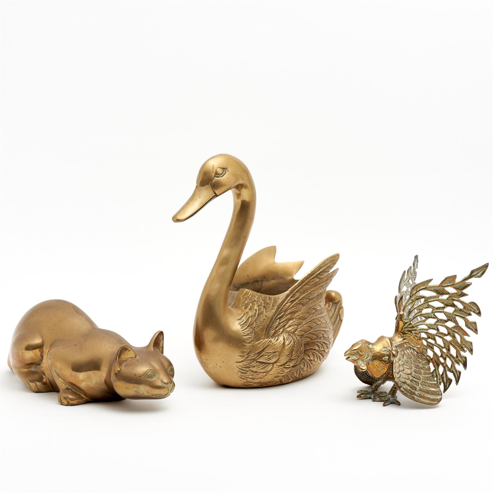 THREE VINTAGE BRASS ANIMALS INCLUDING A SWAN PLANTER, ROOSTER AND CAT H.27CM (TALLEST), LEONARD JOEL DELIVERY SIZE: MEDIUM