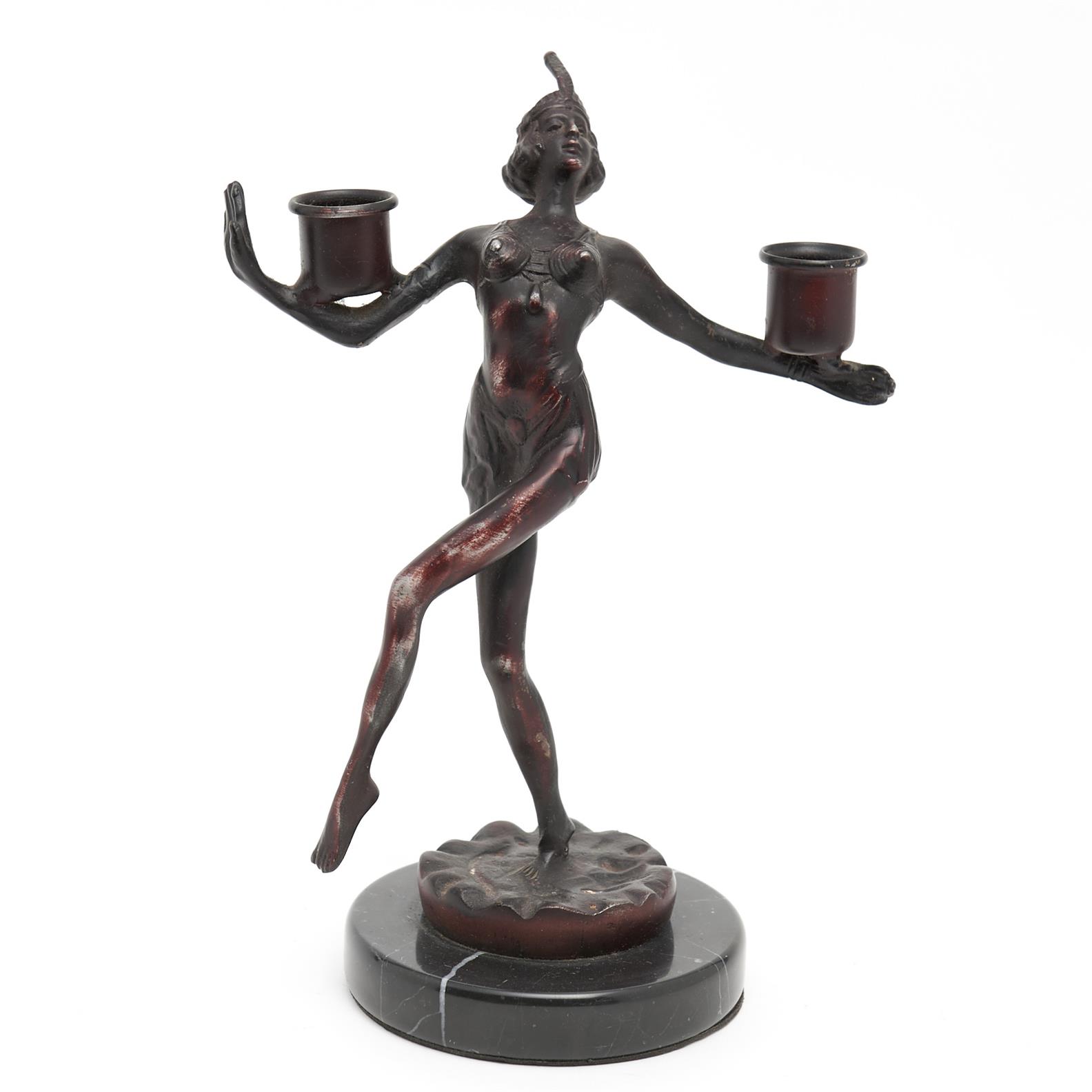 AN ART DECO STYLE BRONZE AND MARBLE FIGURAL CANDLESTICK H.21CM, LEONARD JOEL DELIVERY SIZE: MEDIUM