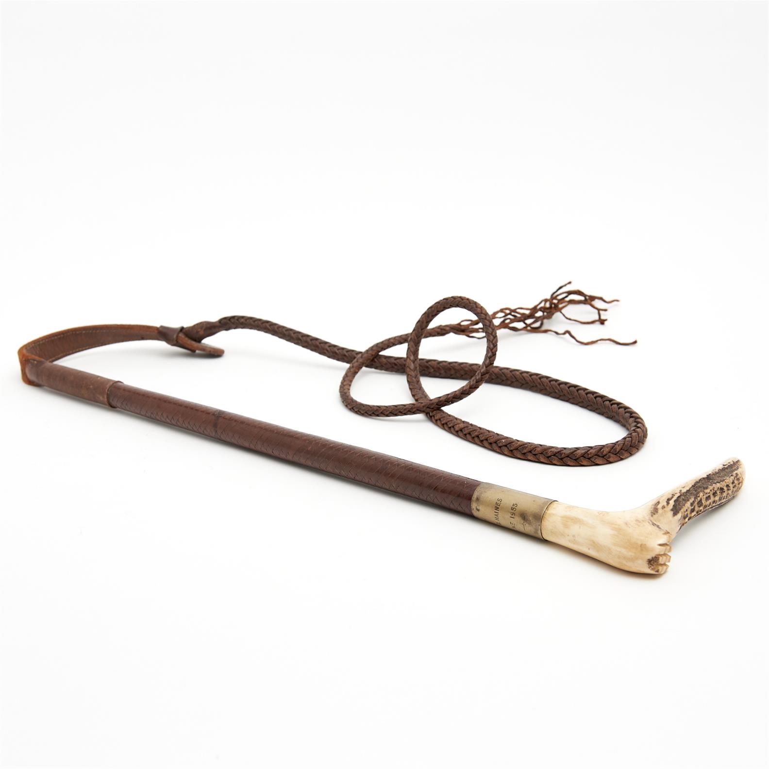 AN ANTIQUE 1900S ANTLER HANDLED AND WOVEN LEATHER RIDING WHIP L.1.75M, LEONARD JOEL DELIVERY SZIE: SMALL