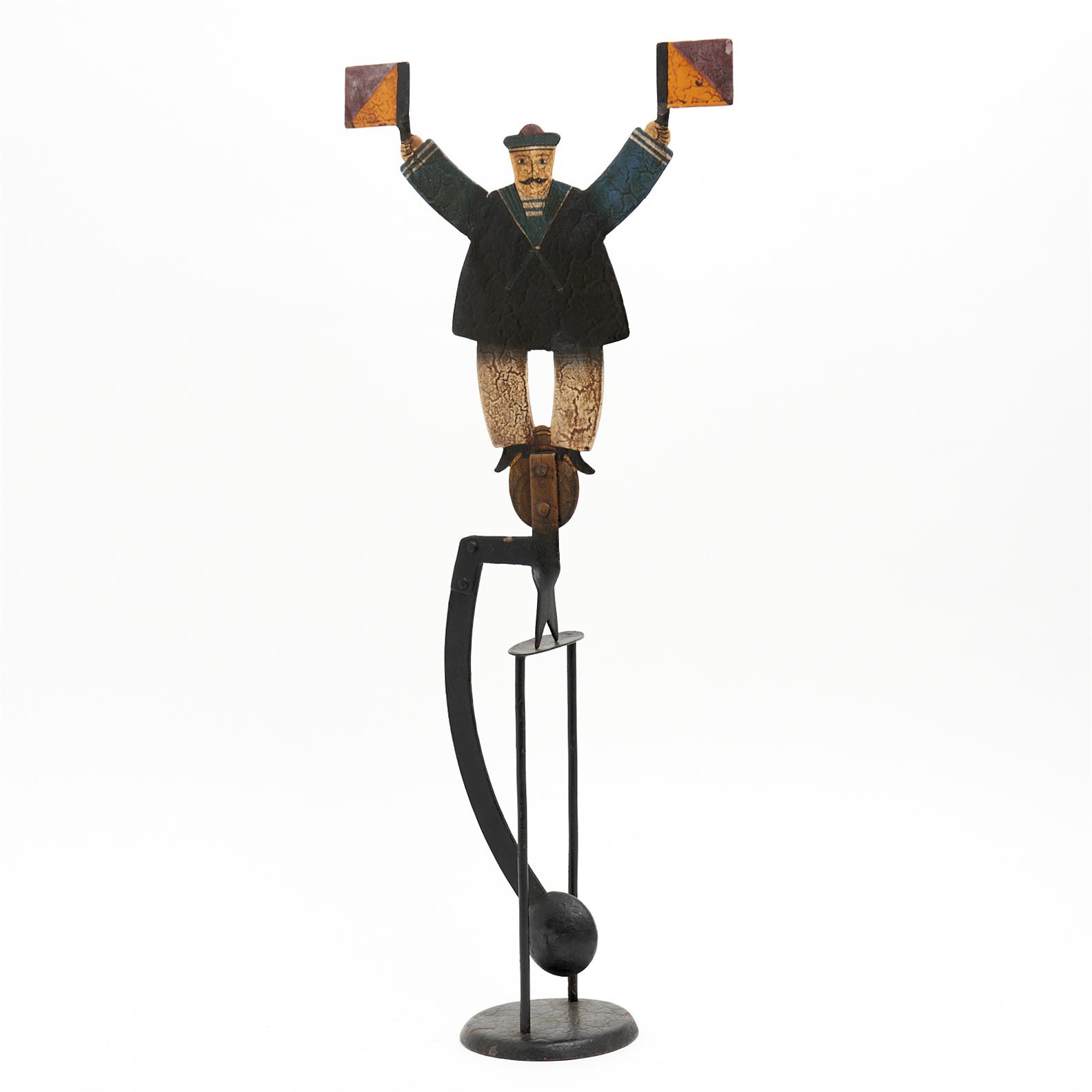 A FRENCH HAND PAINTED METAL MARITIME FLAG SIGNALLER BALANCING FIGURE H.59CM, LEONARD JOEL DELIVERY SIZE: MEDIUM
