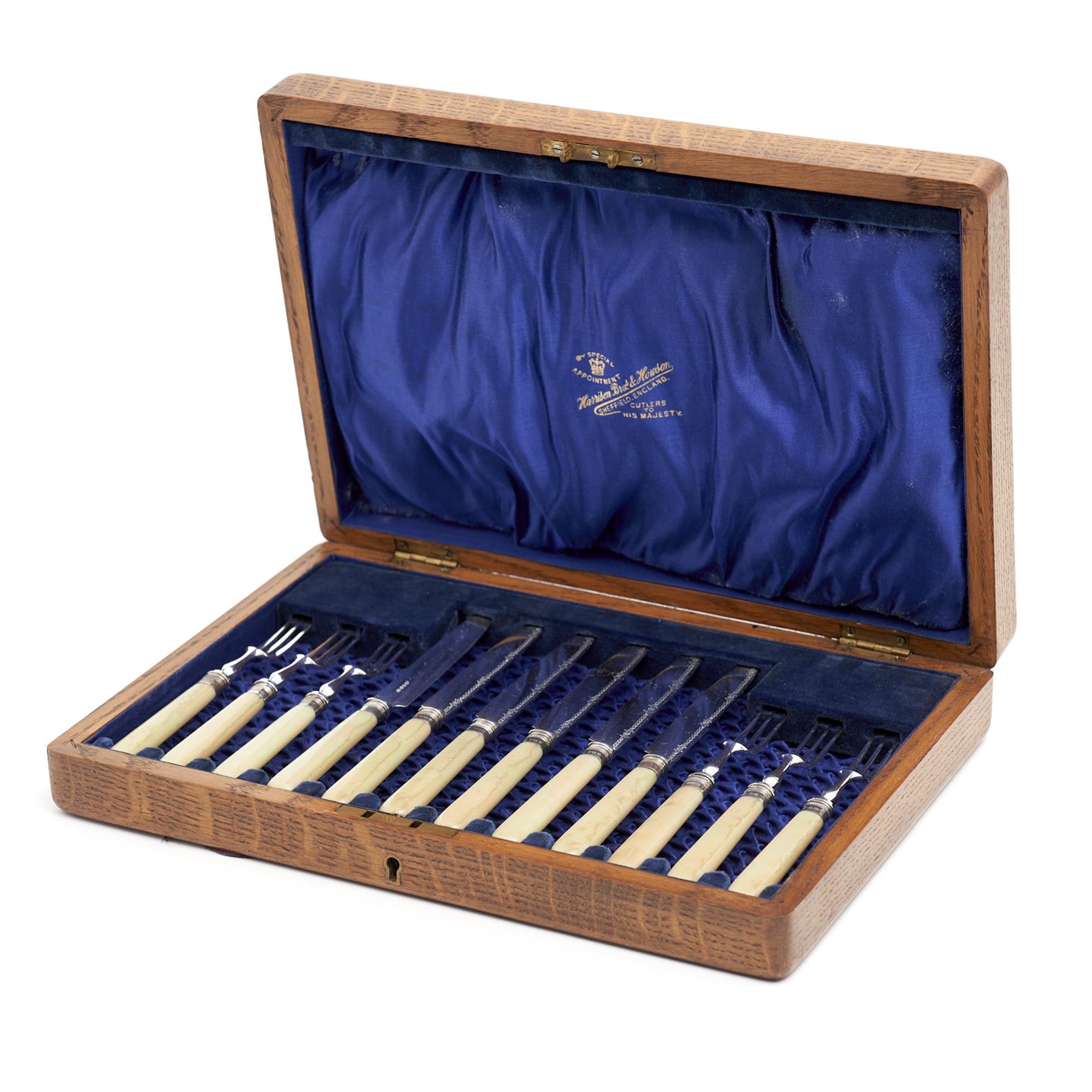 A VICTORIAN CASED HARRISON BROS BAKELITE HANDLED AND STERLING SILVER FERRULE CUTLERY SET FOR SIX W.32CM (CASE), LEONARD JOEL DELIVERY SIZE: MEDIUM