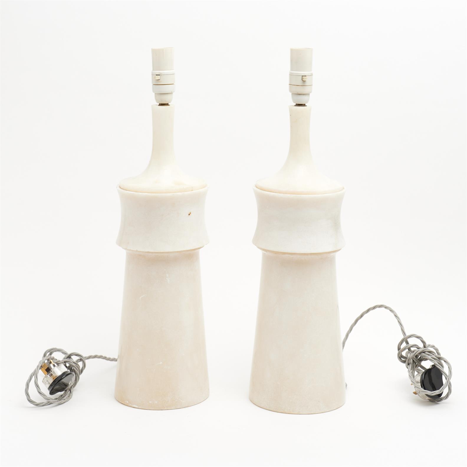 A PAIR OF 1950S ITALIAN CYLINDRICAL MARBLE TABLE LAMPS WITH TWO SILK SHADES (DO NOT FIT BASES) H.54CM LEONARD JOEL DELIVERY SIZE: LARGE