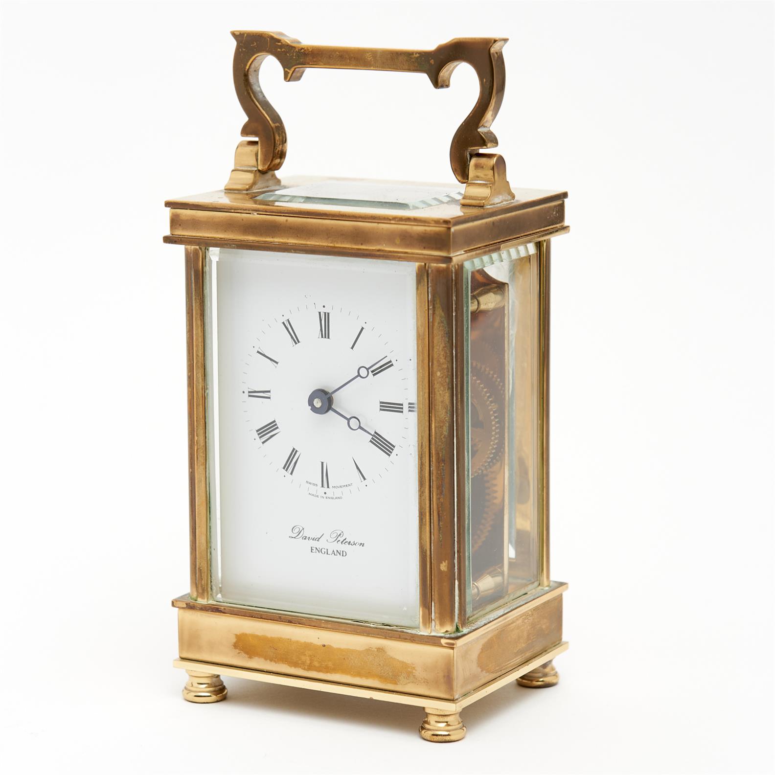 A DAVID PETERSON BRASS CARRIAGE CLOCK WITH KEY H.15.5CM, LEONARD JOEL DELIVERY SIZE: SMALL