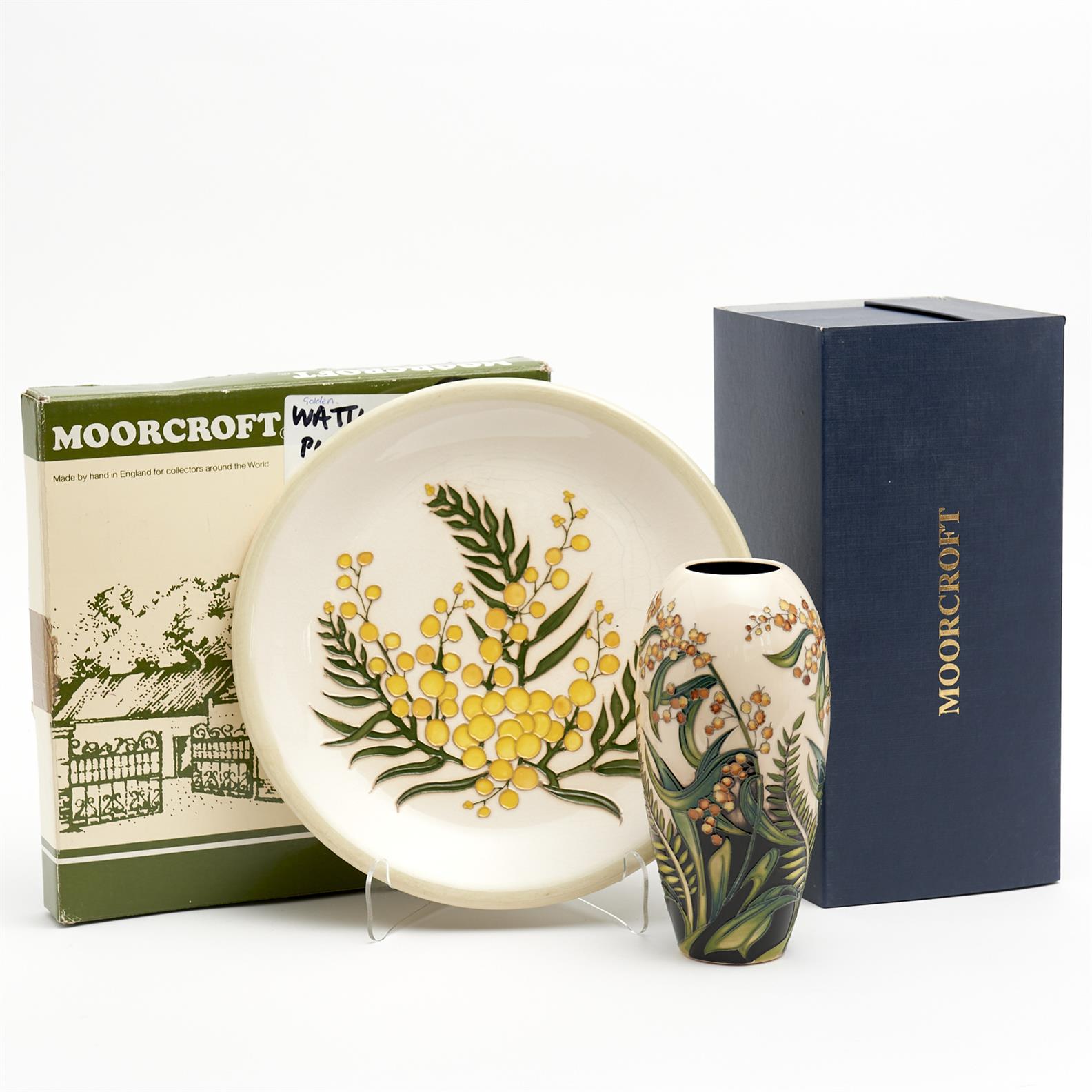 TWO PIECES OF MOORCROFT GOLDEN WATTLE & SILVER FERN PATTERN INCLUDING A VASE AND PLATE H.19CM (TALLEST), LEONARD JOEL DELIVERY SIZE: MEDIUM