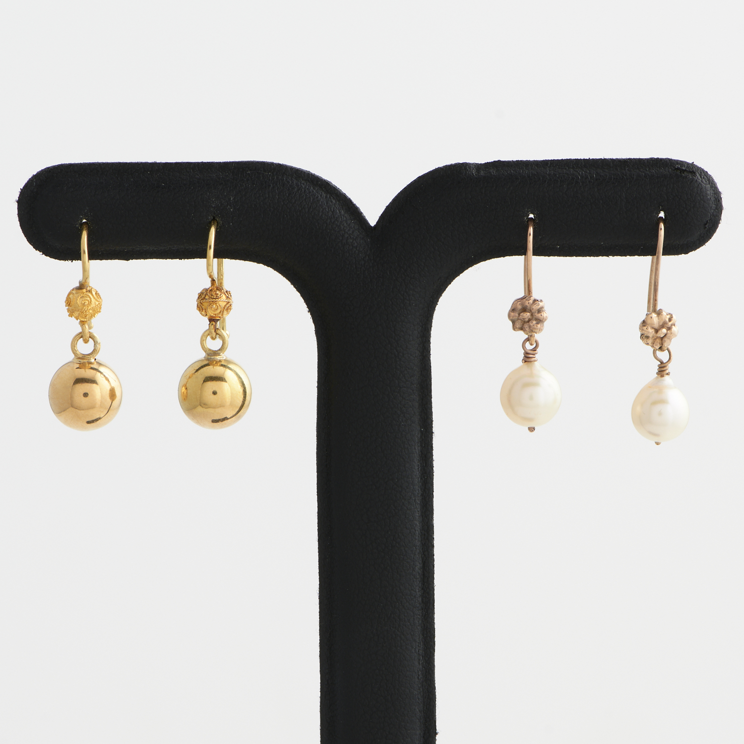 A PAIR OF PEARL EARRINGS IN 9CT GOLD, TOGETHER WITH A PAIR OF BALL EARRINGS IN 9CT GOLD, BOTH TO SHEPHERD HOOK FITTINGS, 22MM AND 25MM, 4.2GMS