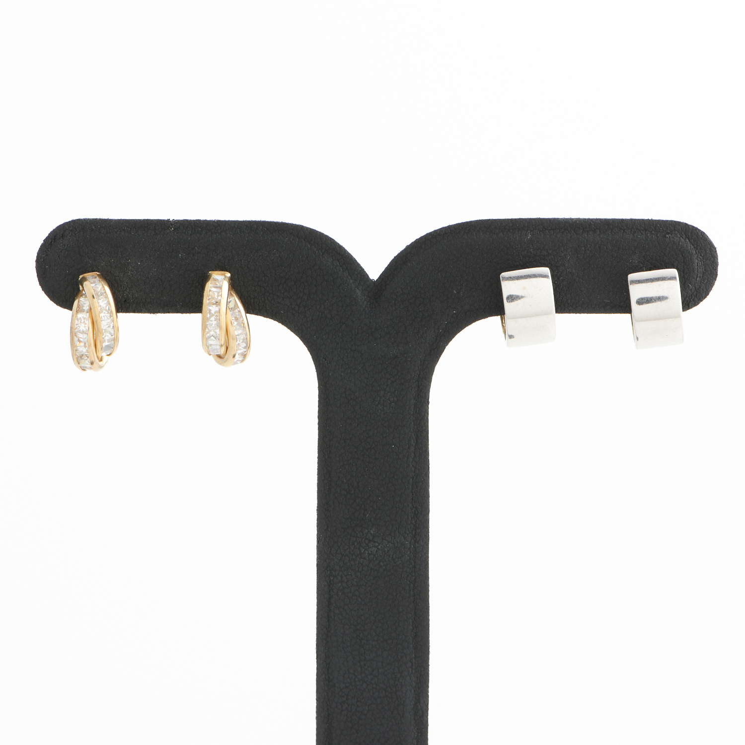 A PAIR OF GEM SET EARRINGS IN 9CT GOLD, TOGETHER WITH A PAIR OF HUGGIE EARRINGS IN 9CT WHITE GOLD, BOTH TO POST FITTINGS, 4.2GMS