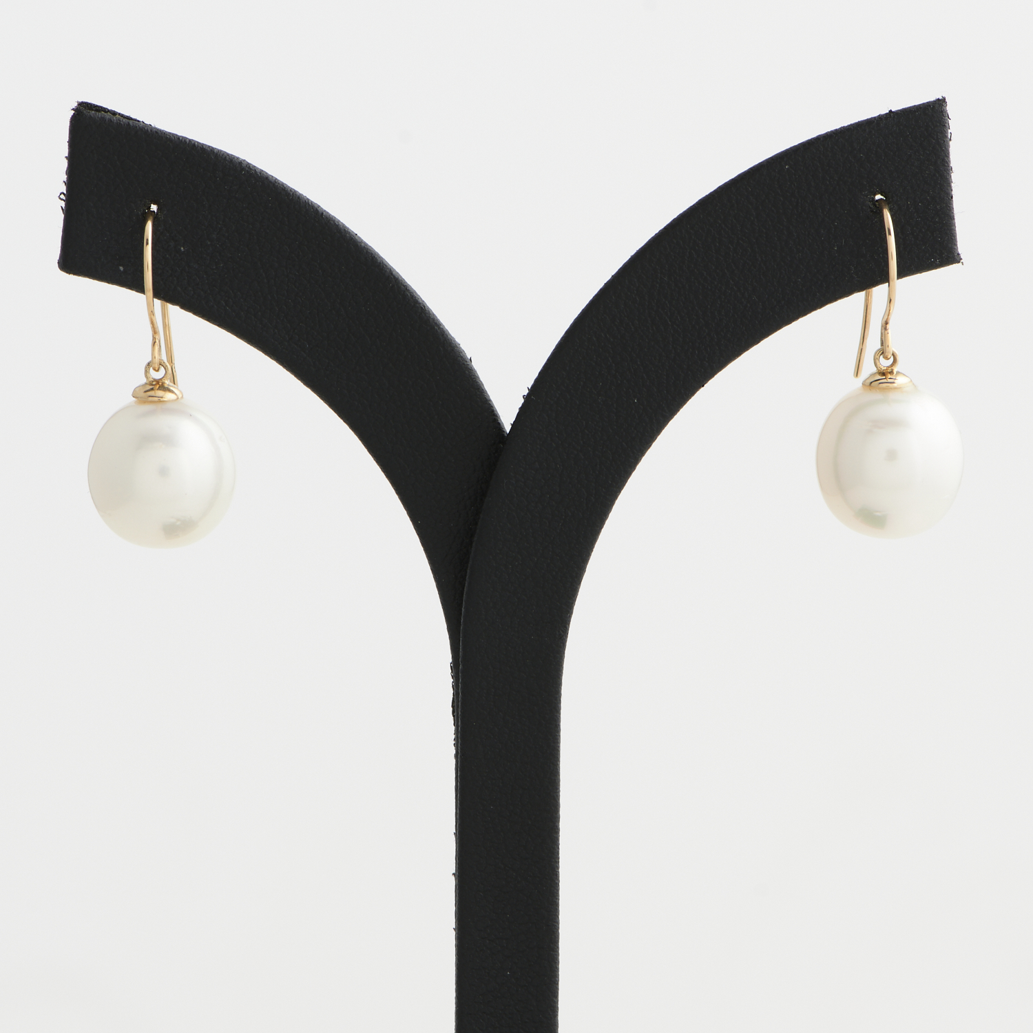 A PAIR OF SOUTH SEA PEARL EARRINGS IN 9CT GOLD, TO SHEPHERD HOOK FITTINGS, THE PEARLS MEASURING APPROXIMATELY 12MM