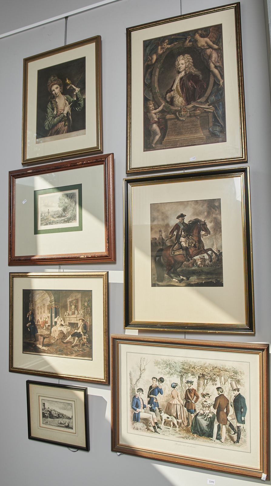 A COLLECTION OF SIX FRAMED ANTIQUE PRINTS AND FACSIMILES INCLUDING THE MARRIAGE OF LA MODE, AND AN EXPLORERS CAMP, 62 X 45CM (LARGEST), LEONARD JOEL DELIVERY SIZE: LARGE