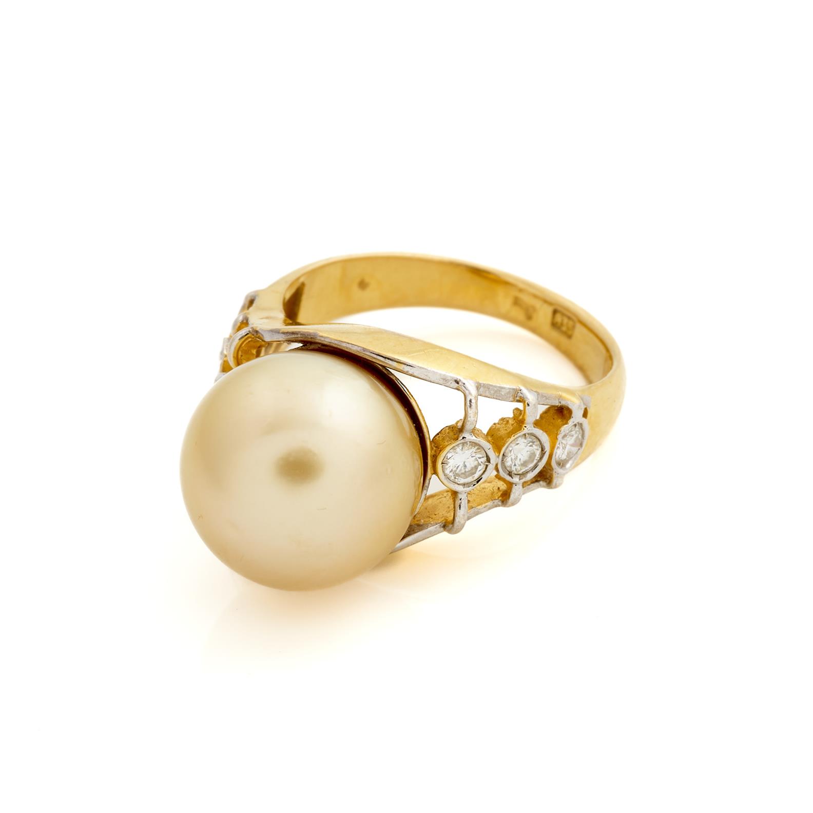 A GOLDEN SOUTH SEA PEARL AND DIAMOND RING IN 20CT GOLD, THE PEARL MEASURING 12MM, SIZE L