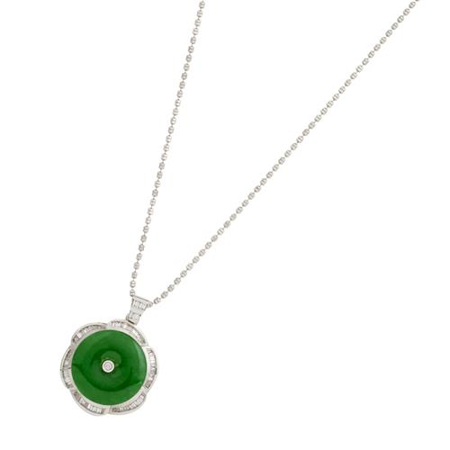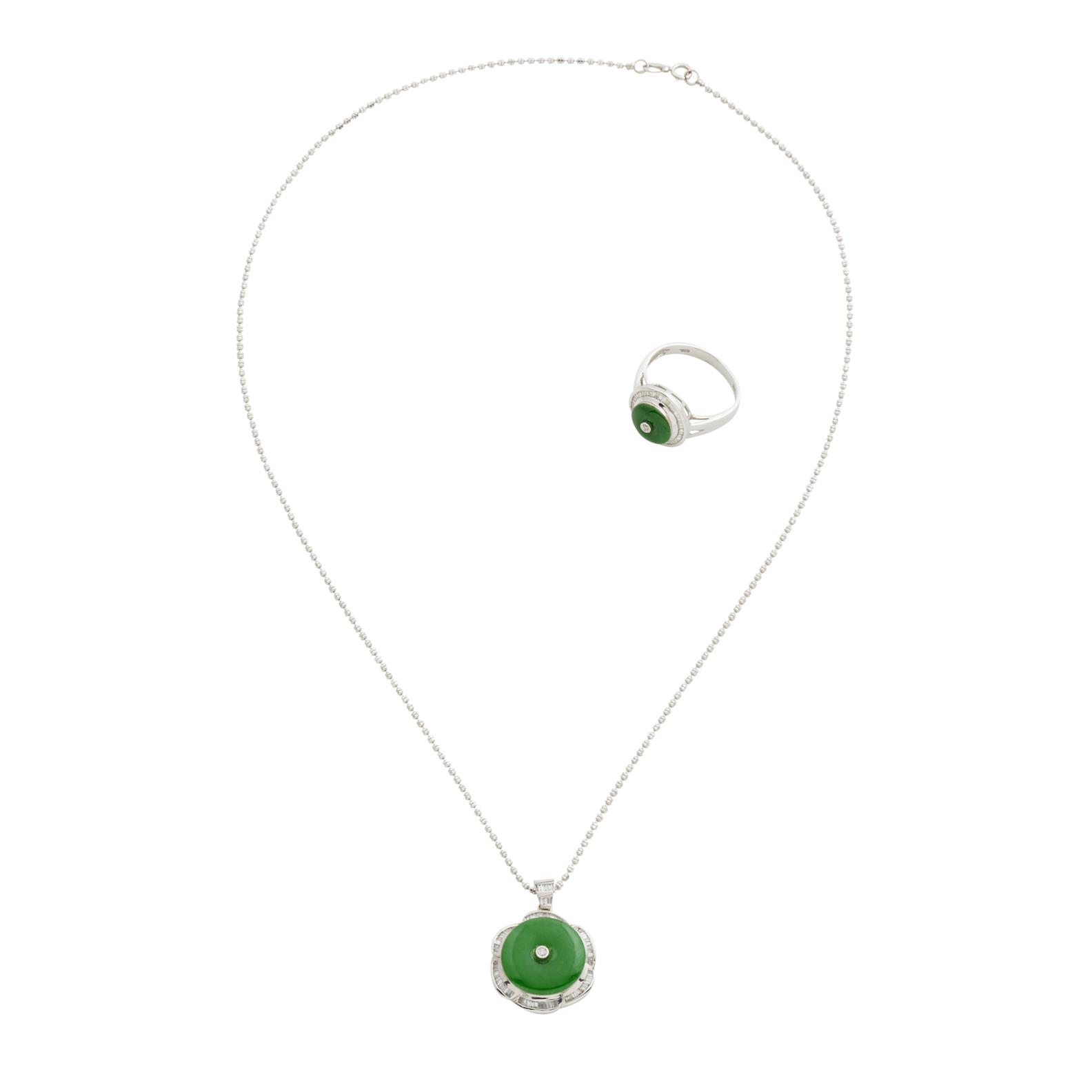 The pendant set with a circular jade plaque centred by a brilliant-cut diamond within a petalled border and bale set with baguette diamonds, the ring en suite, pendant approximately 20mm diameter, necklace length approximately 450mm, ring size K.5, gross weight approximately 8.3 and 3.4 grams respectively.