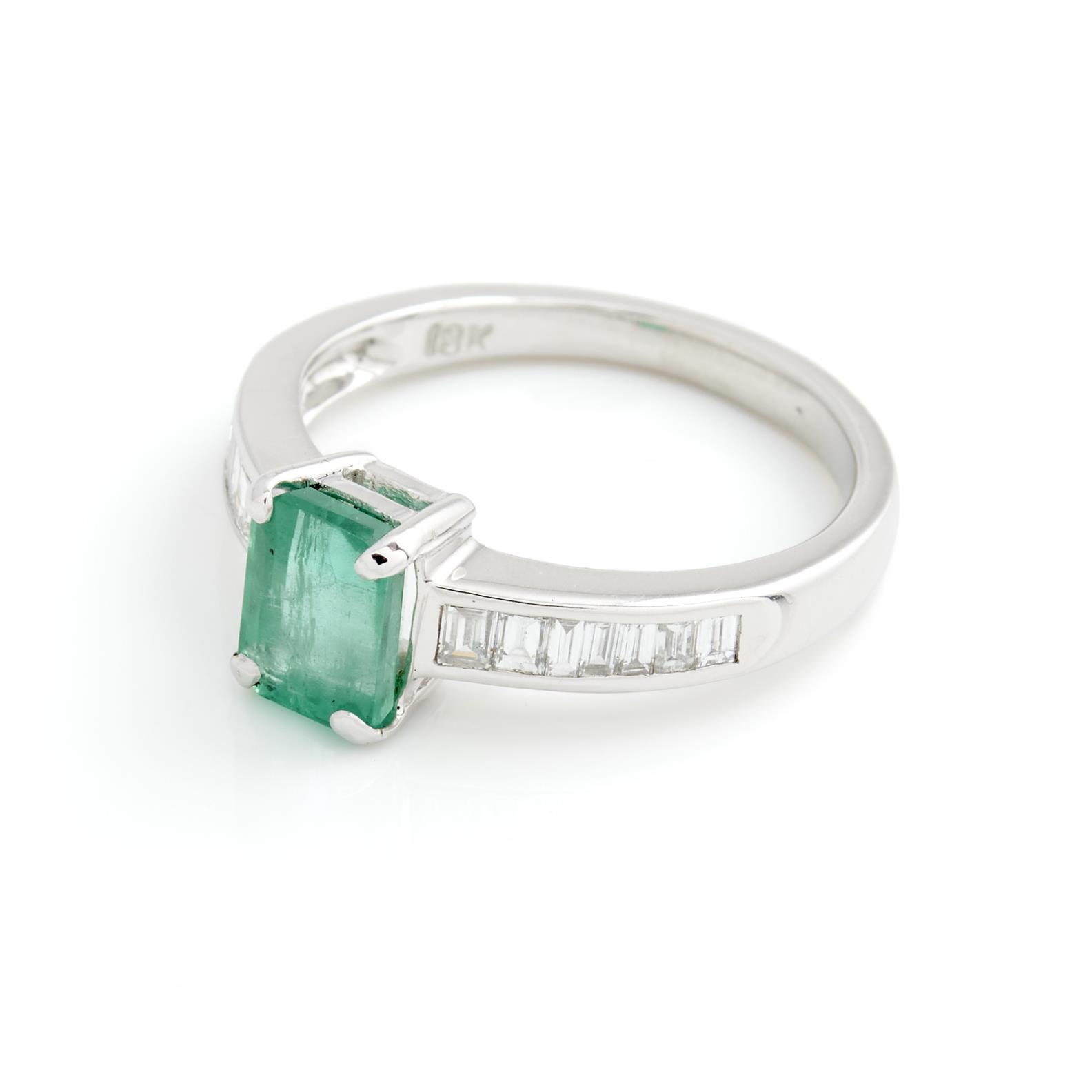 A COLOMBIAN EMERALD AND DIAMOND RING IN 18CT WHITE GOLD, THE EMERALD WEIGHING APPROXIMATELY 1.20CTS, WITH DIAMONDS TOTALLING 0.50CT (F-G/VS), SIZE L, ACCOMPANIED BY A VALUATION