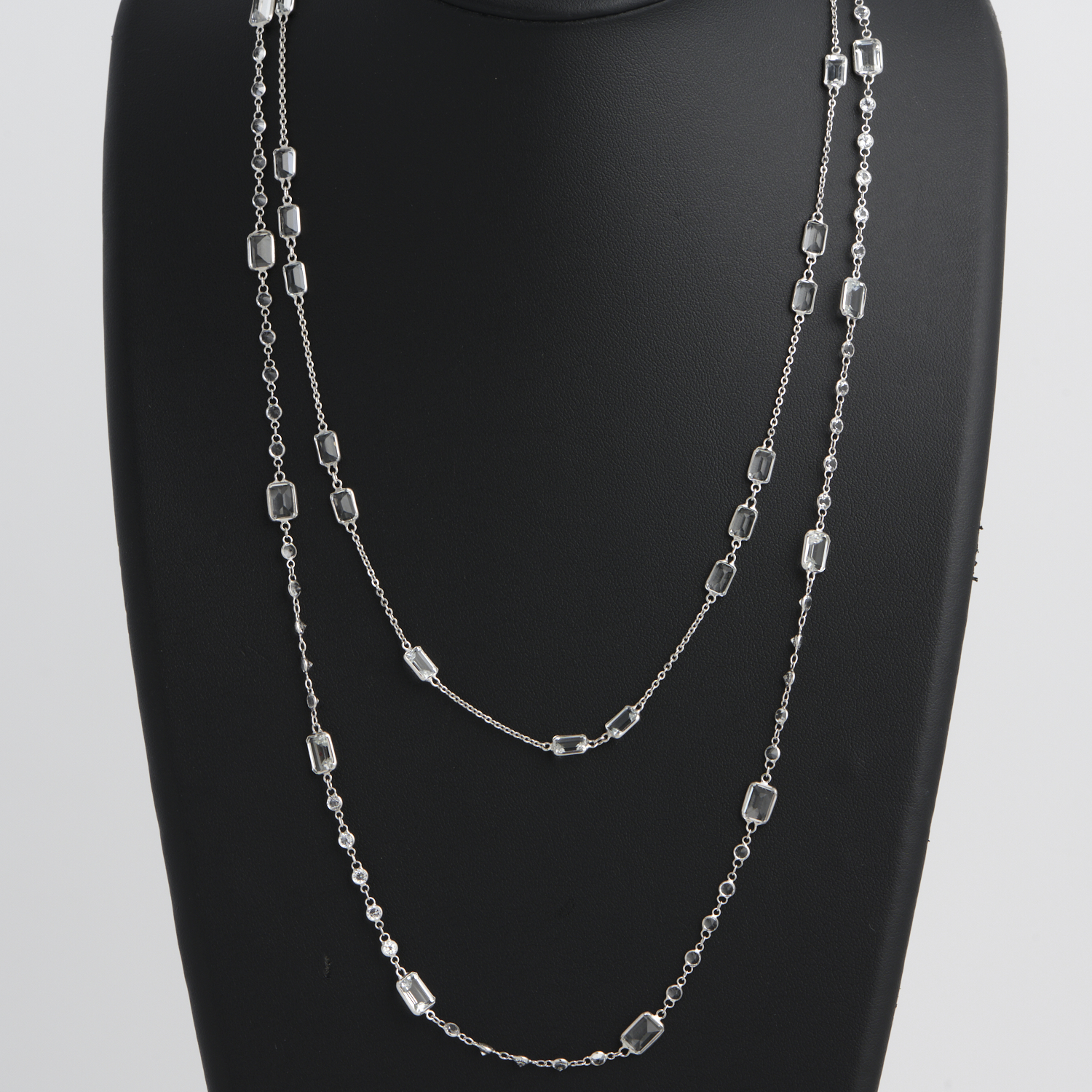 A WHITE TOPAZ NECKLACE IN 18CT WHITE GOLD, TO AN OVAL CLASP, 720MM, 16.2GMS