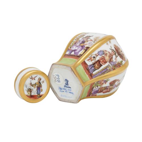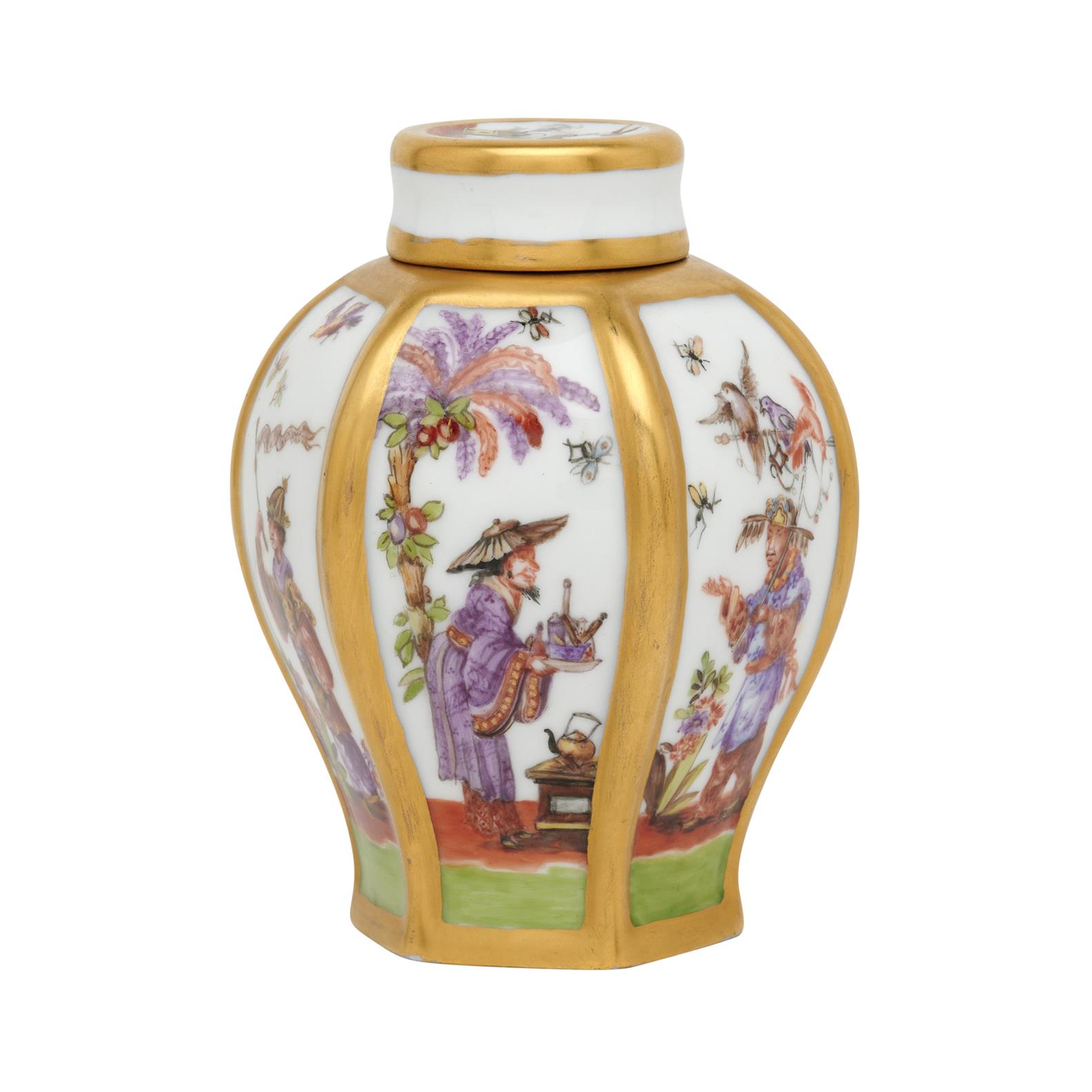 Hexagonal and baluster in form, with a flat round cover decorated on-glaze, with alternating chinoiserie figures, birds and insects, all within gold bands. The cover uniformly decorated. Under-glaze blue Dresden factory mark. On-glaze blue ‘JlAustin 2001' to canister and under cover.