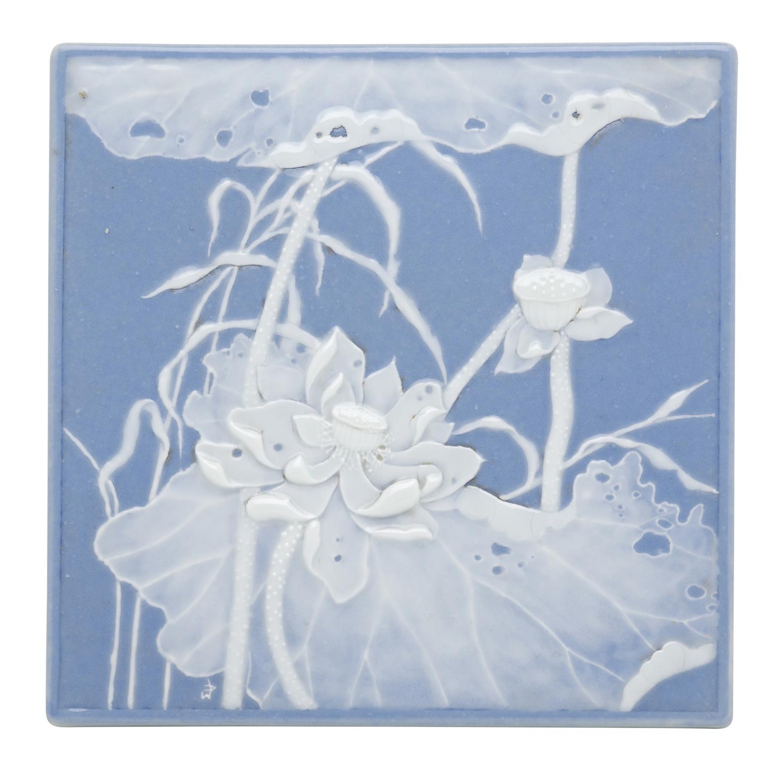 Square, painted pale blue and applied with a paler blue slip to create lotus flowers, emulating pâte-sur-pâte technique.