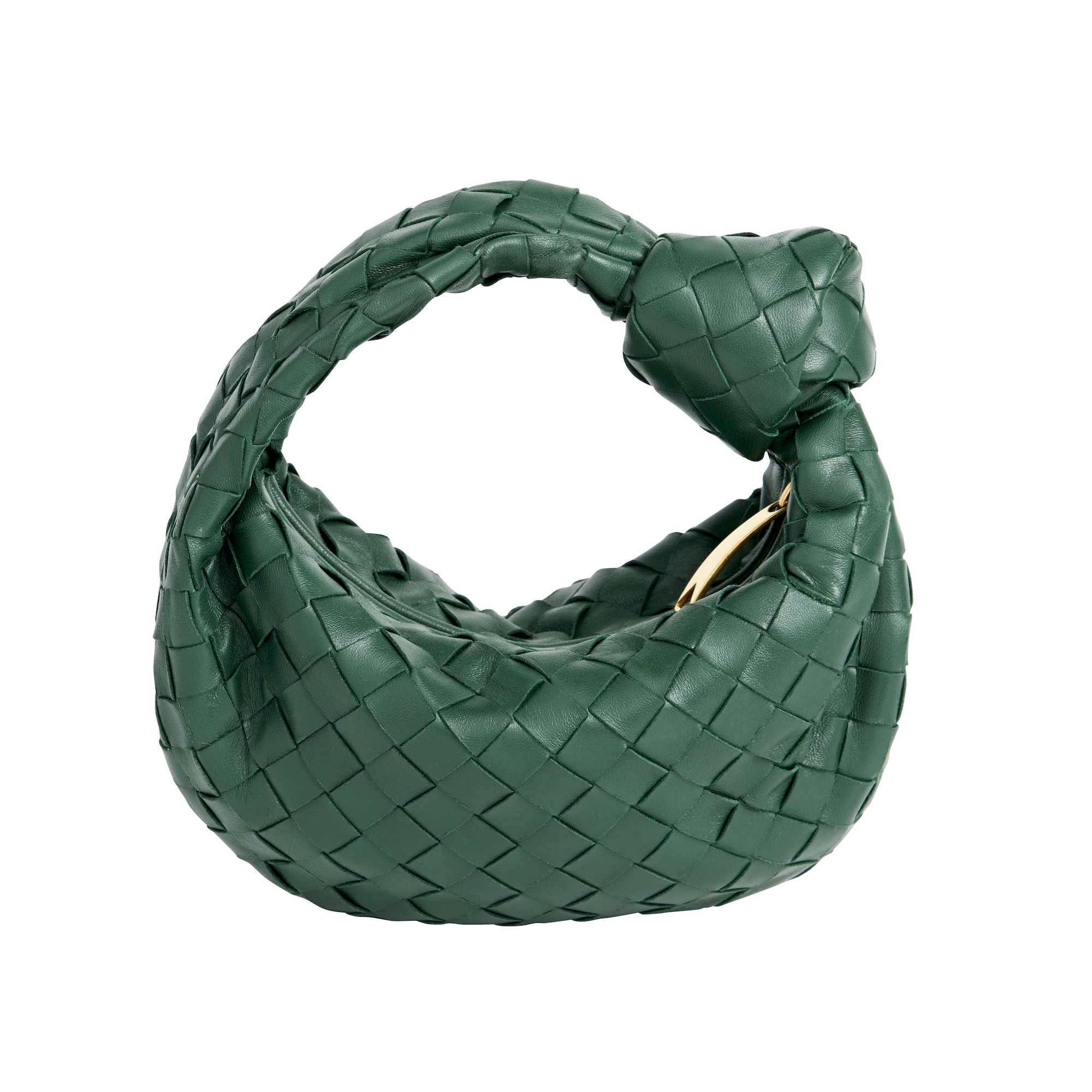 Styled in Raintree green Intrecciato weave Nappa leather with gold tone hardware and knotted handle detail, 14 x 23 x 4cm.