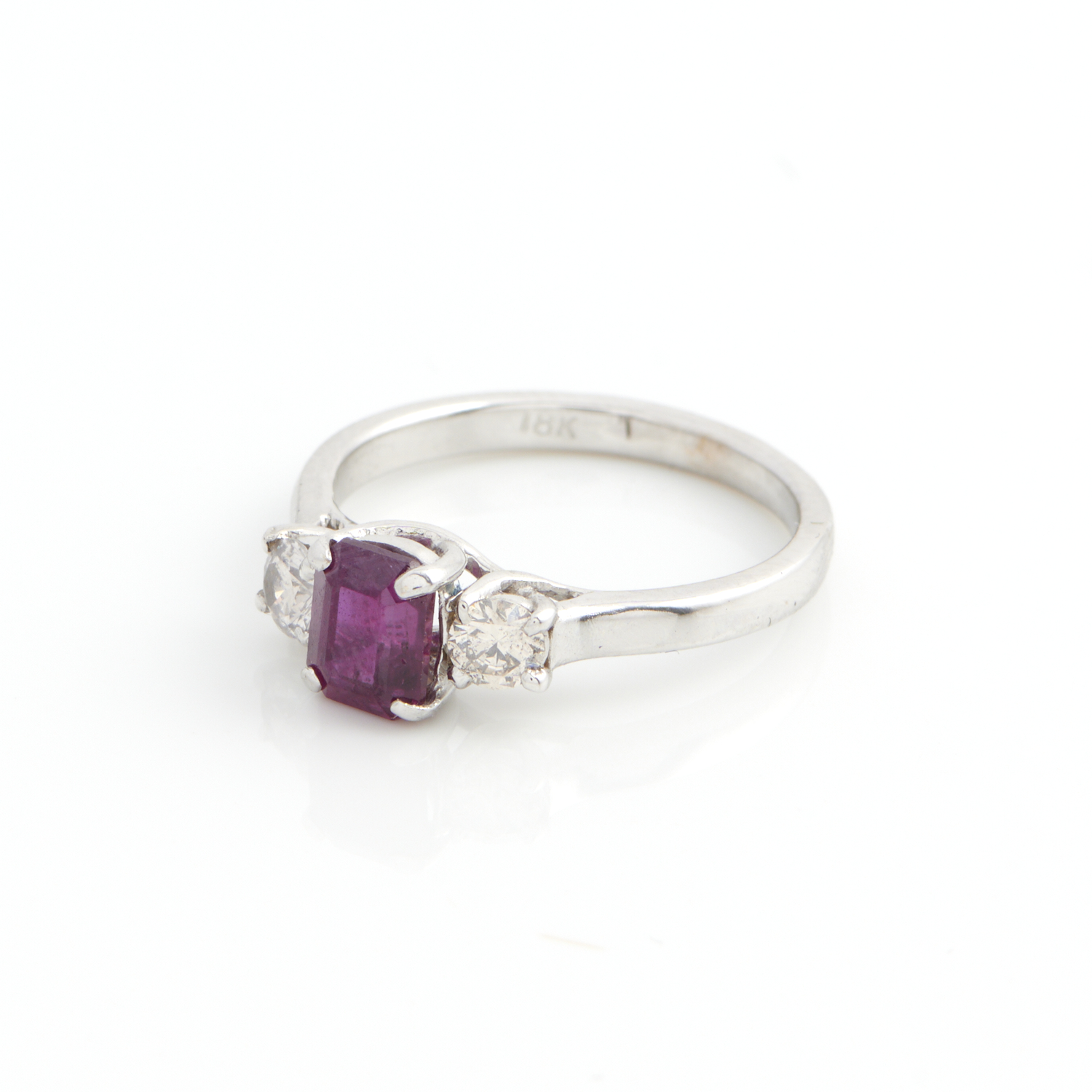 AN UNHEATED MOZAMBIQUE RUBY AND DIAMOND RING IN 18CT WHITE GOLD, THE RUBY WEIGHING 1.26CTS, THE DIAMONDS TOTALLING 0.38CTS, SIZE N, 3.4GMS, ACCOMPANIED BY A GEMSTONE CERTIFICATE AND VALUATION