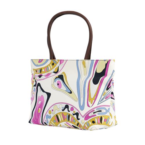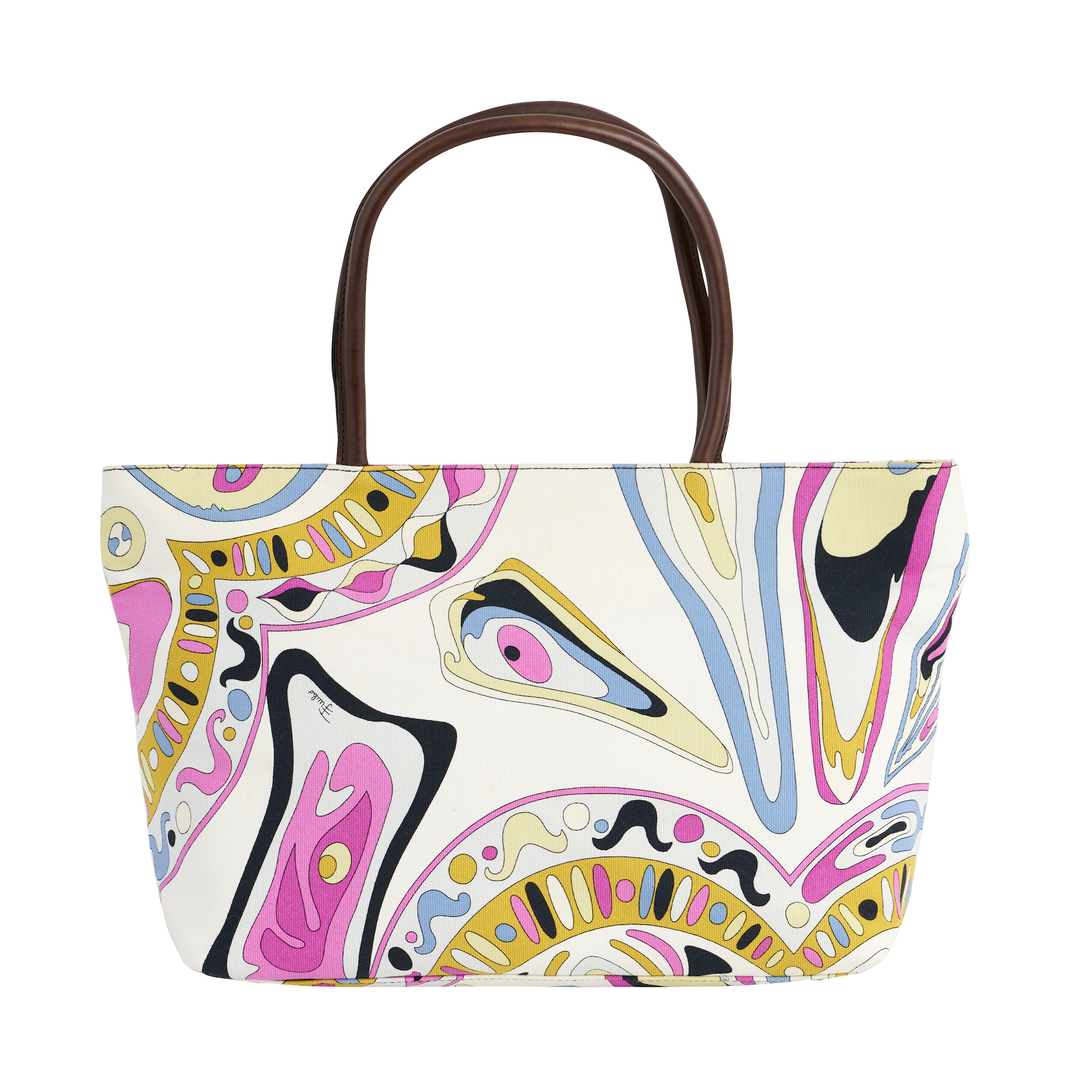 Styled in multicolor canvas with brown rolled calf leather handles, 24 x 32 x 13 cm.