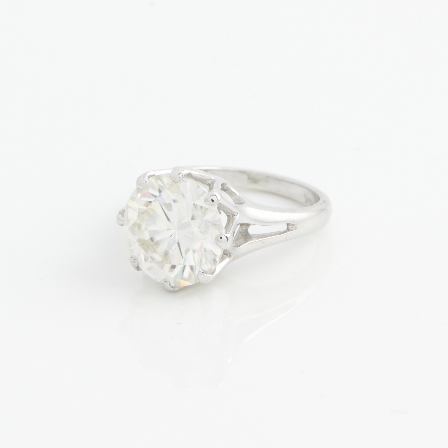 A MOISSANITE RING IN 18CT WHITE GOLD, THE MOISSANITE WEIGHING 6.15CTS, SIZE M