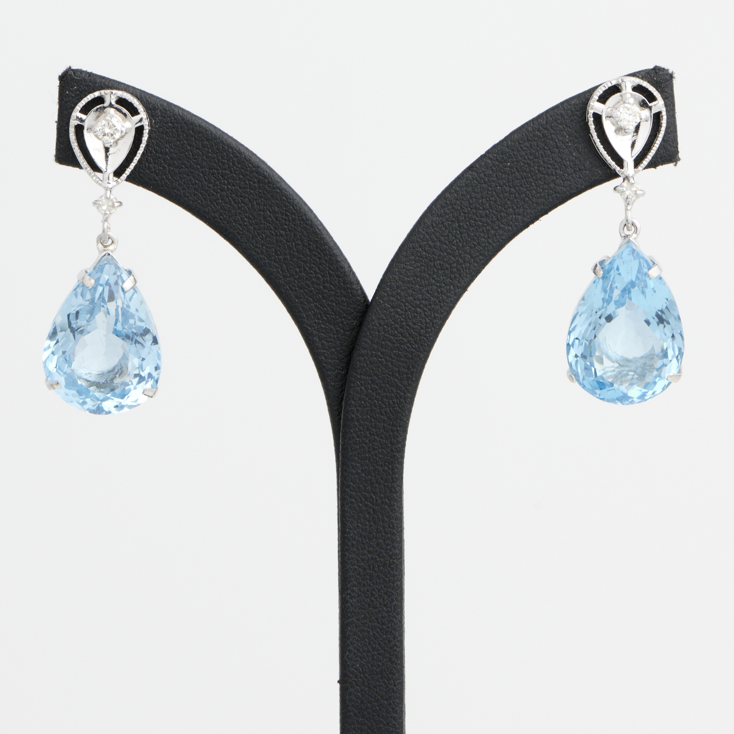 A PAIR OF TOPAZ AND DIAMOND EARRINGS IN 18CT WHITE GOLD, THE TOPAZ TOTALLING 35.38CTS, TO POST AND BUTTERFLY FITTINGS, LENGTH 36MM