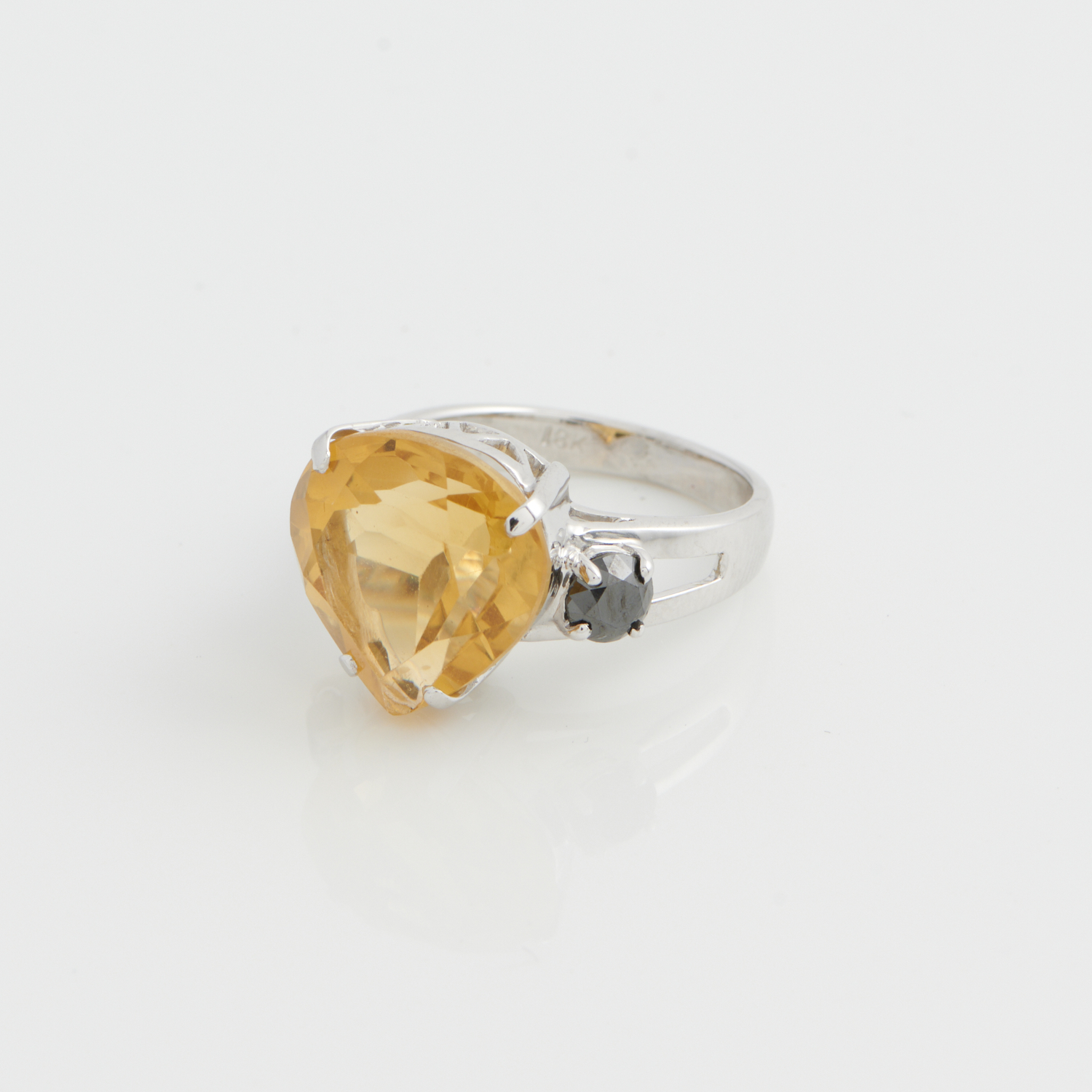 A CITRINE AND BLACK DIAMOND RING IN 18CT WHITE GOLD, THE CITRINE WEIGHING 8.92CTS, WITH DIAMONDS TOTALLING APPROXIMATELY 0.88CTS, SIZE N