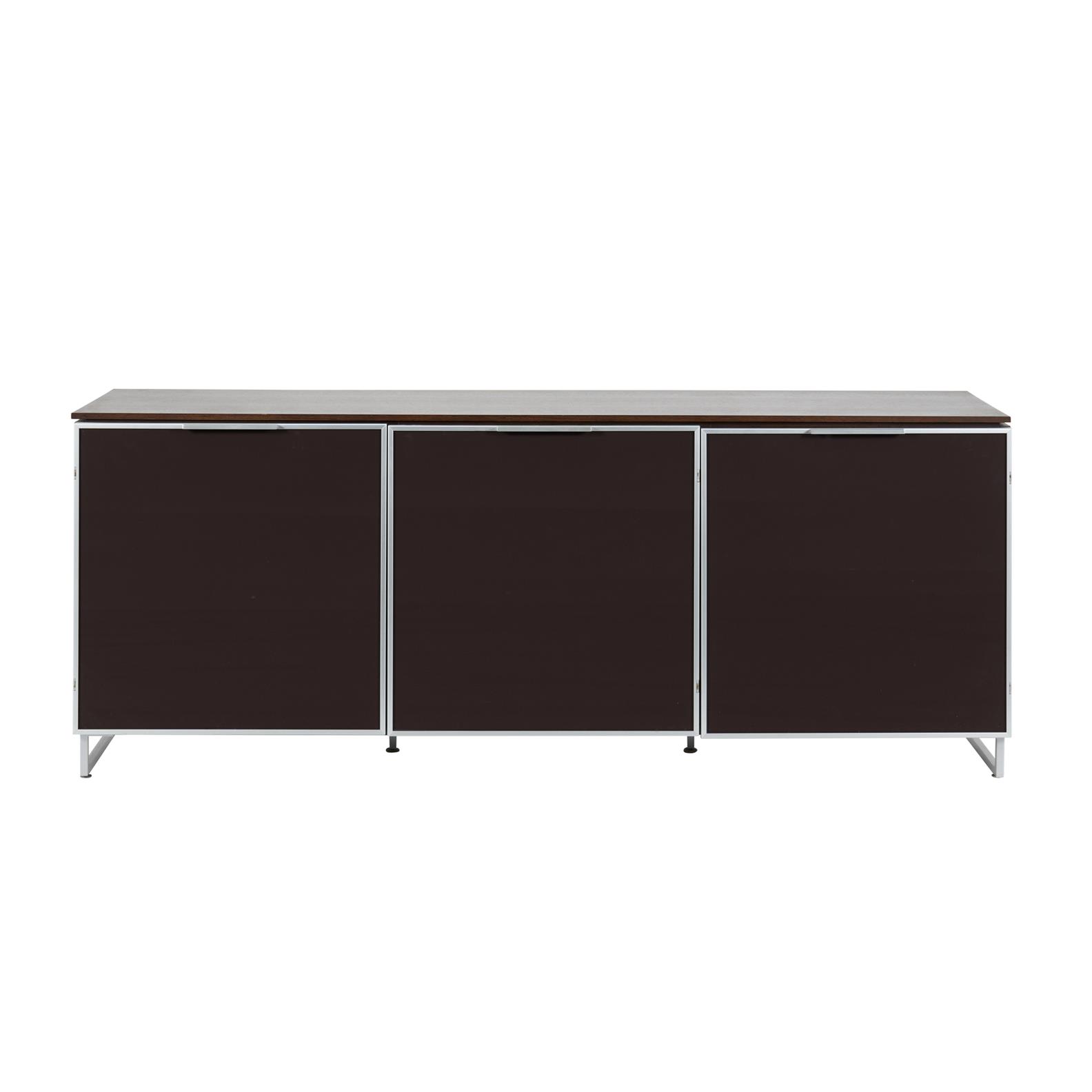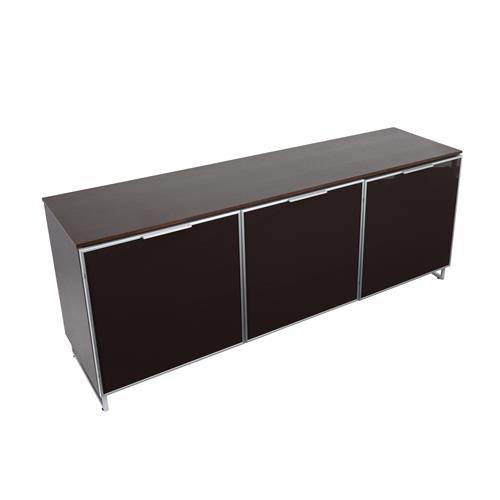 Wooden frame with wenge finish. Three aubergine backed glass doors with aluminium details. Interior with glass shelves.