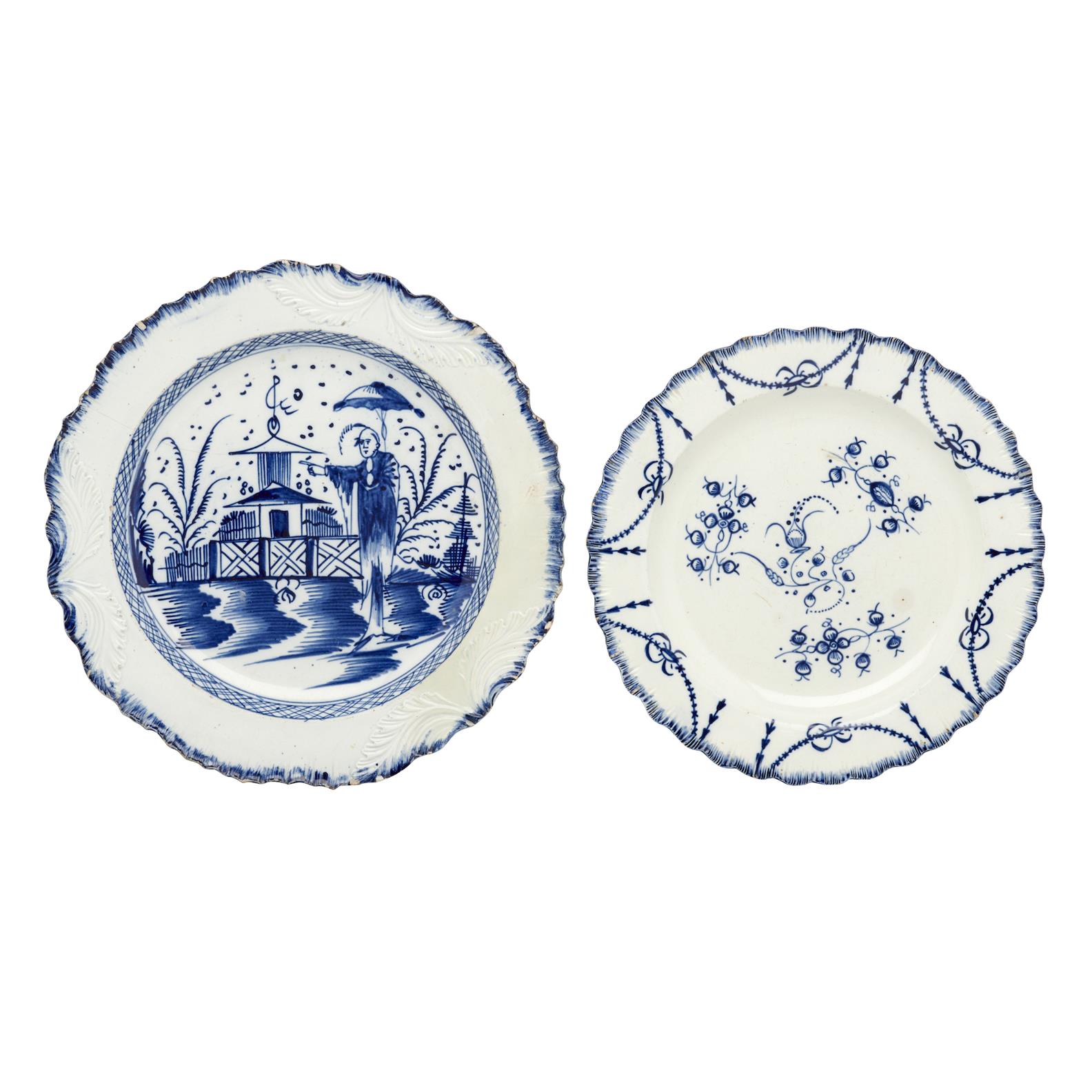 The first in pearlware, moulded in the form of shells around the rim decorated in under-glaze blue with four sprigs of stylised flowers in the centre and swags of leaves around the rim over a blue band on the edge. The second painted in under-glaze blue in Long Eliza pattern with a Chinese figure with a parasol standing in a landscape.
