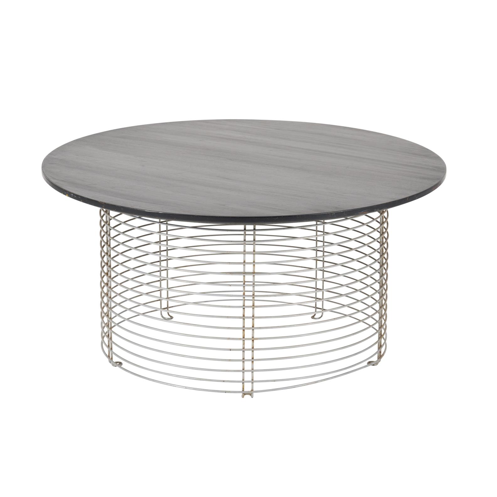 Of circular form with ebonised laminate wood tabletop on steel wire frame.