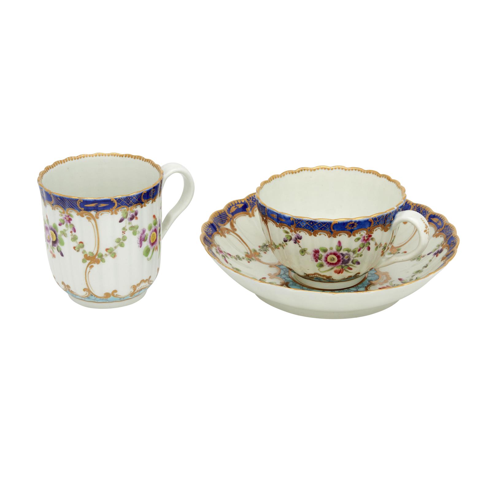 A scalloped and fluted tea, coffee and saucer decorated with floral swags within gilt blue c-scrolls borders. Under-glaze blue open crescent on each
