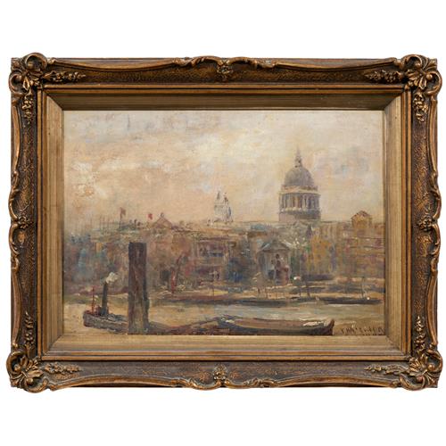 Thames and St Paul's Cathedral 1908, Lot 10, is one of a number of paintings McCubbin produced depicting the pool of London, that reach of the River Thames thronged with shipping. Other works of this scene include The Pool of London (Barges, Pool of London) 1907, Private Collection, and The Pool of London 1907, National Gallery of Victoria, Melbourne. In each of these depictions the distant hazy sky carries an opalescent shimmer which sweeps over almost half the composition. In Thames and St Paul's Cathedral the skyline is punctuated with the dome of St Paul's which looms high over the busy city below. McCubbin captures the muted blues, reds, purples and ochres of smoggy industrial London. Painted from the south side of the river at a low vantage point, the sliver of water shows brief glimpses of the sky's reflection. The foreground depicts barges dotted along the banks of the river with one in motion moving toward the left edge of the composition, soon to be out of sight. This series of paintings paid homage to Turner not only through the gentle shimmer of light and the choice of subject matter, but also in composition. The similarity to Turner's Venetian paintings is striking, particularly in the celebration of the waterways and the architecture of the city.