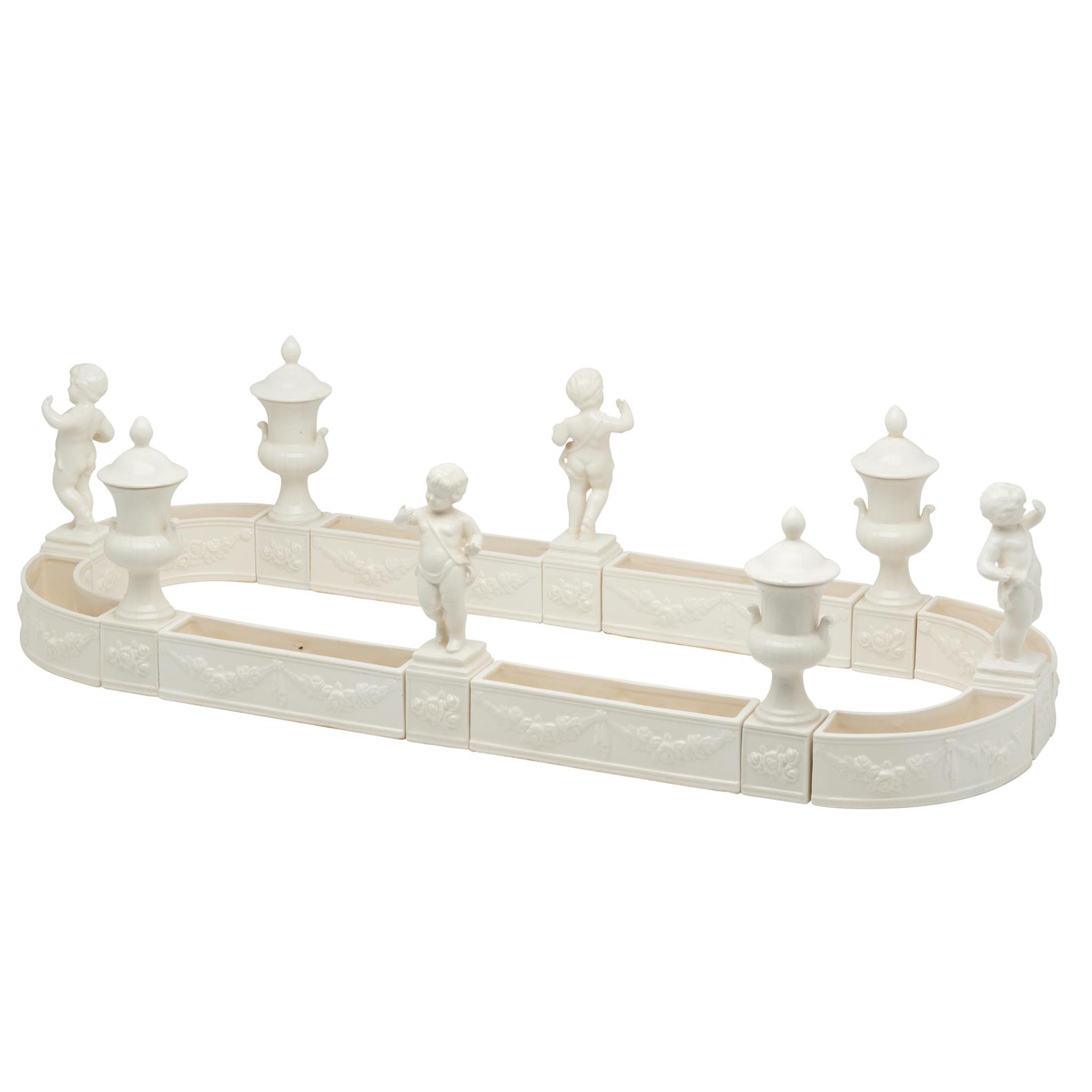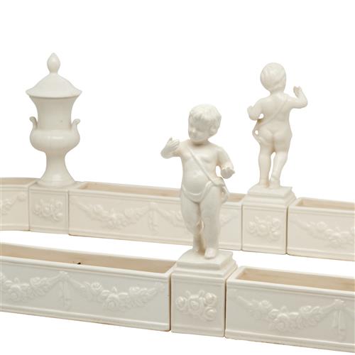Comprising fifteen separate parts, joining to form an arrangement of alternating urns, cherubs and troughs in the form of a ring.