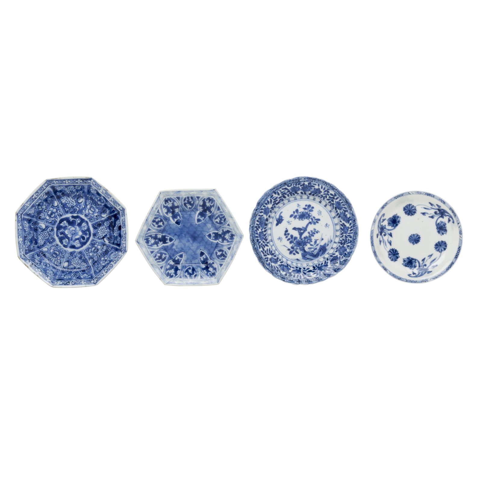 The first dish decorated in under-glaze blue with thin diapered band. The centre with chrysanthemums, under-glaze blue character to underside, circa 1750.