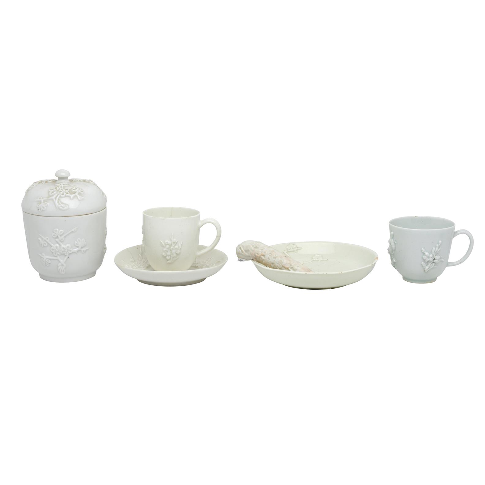 The third a rare Vauxhall coffee cup, decorated with an applied spray of chrysanthemum to centre and two smaller sprays on each side, circa 1753 - 1754, together with a Capodimonte saucer dish decorated with three sprigs of prunus blossom, circa 1745 and a Bow prunus decorated pistol grip fork handle, circa 1755