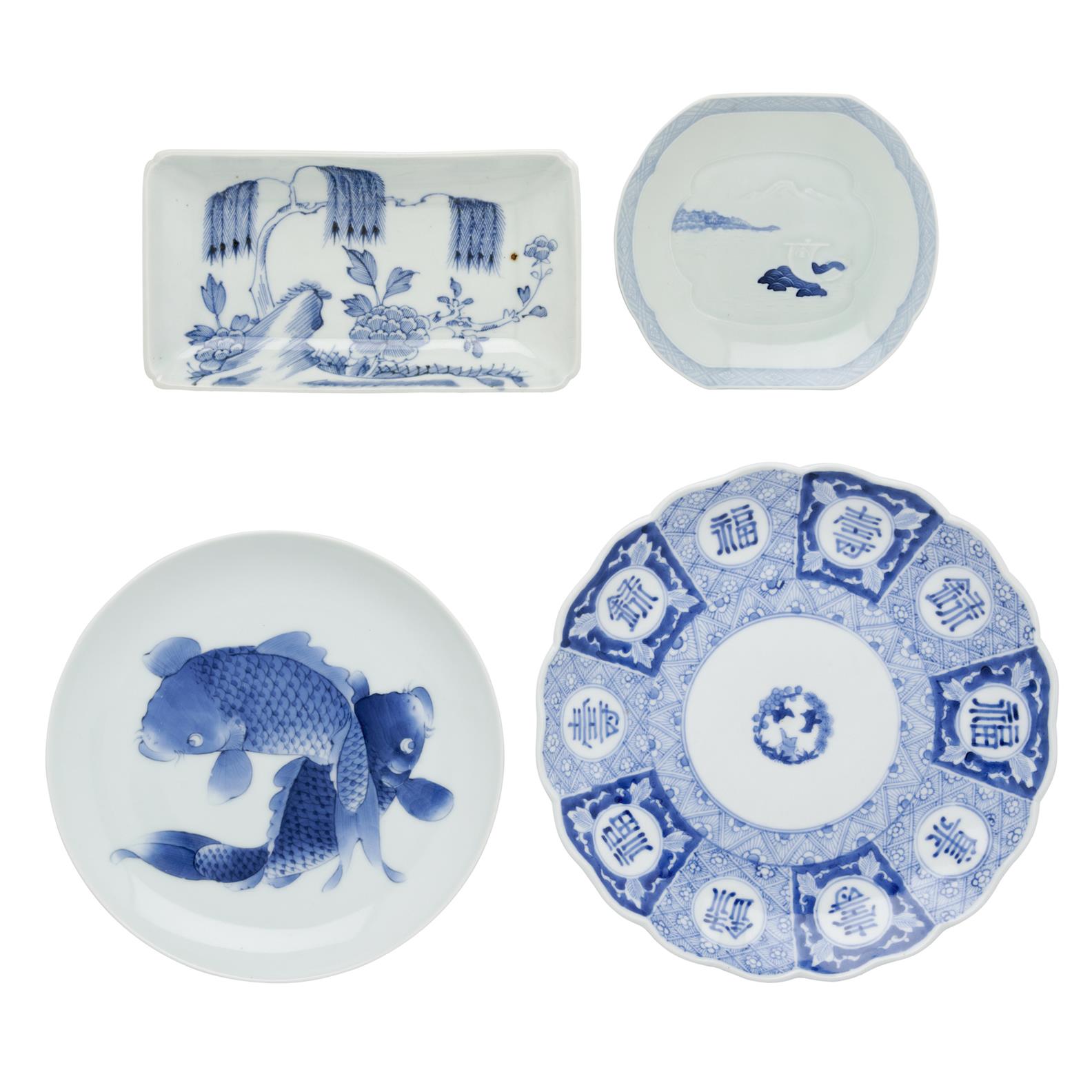The first, painted in under-glaze blue with alternate panels of leaf and flower and a hatched background, each with a reserve containing long life and good health characters, the centre with a rotating sochikubal (plum, pine and bamboo), four characters mark to base , Edo period.